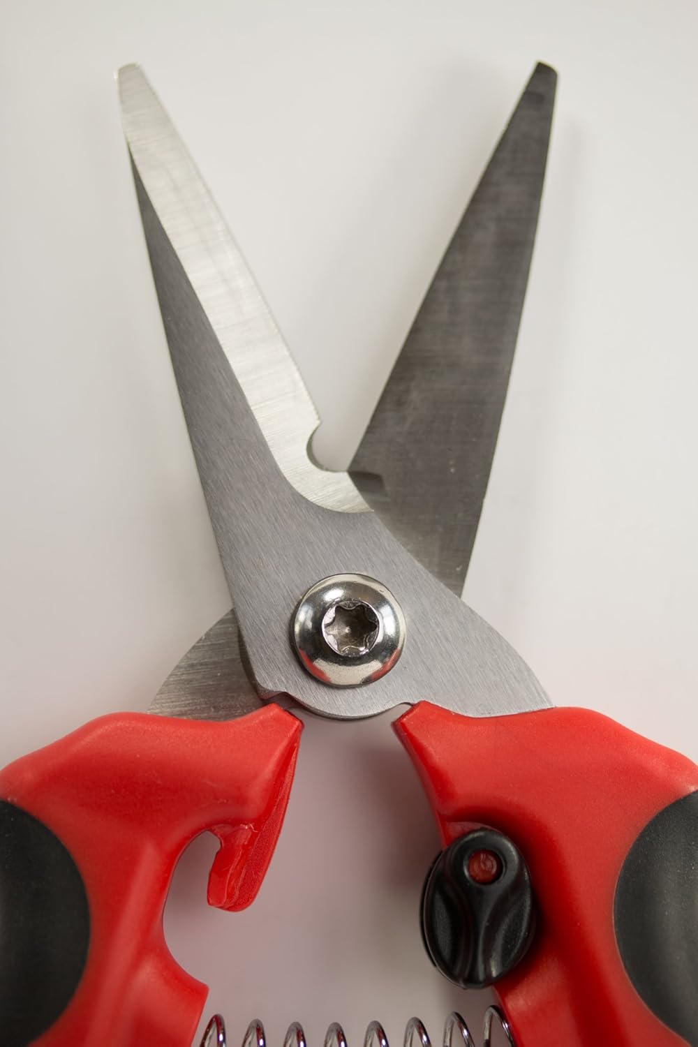 Designed to cut copper, aluminum, leather, plastic, and other materials, these heavy duty scissors are the perfect tool for cutting cables up to 1/4” in diameter. These scissors feature the following: One blade is serrated for a tight and secure grip while cutting Wire stripper accommodates 18, 14, and 12 AWG (1.0, 1.5, and 2.0 mm2 cross sectional area) wire Dual component polypropylene (PP) and thermoplastic rubber (TPR) grip for greater comfort and ergonomics Includes a safety locking mechanism and adjustment screw for convenience Not for use on stainless steel or other hardened/heat treated metals