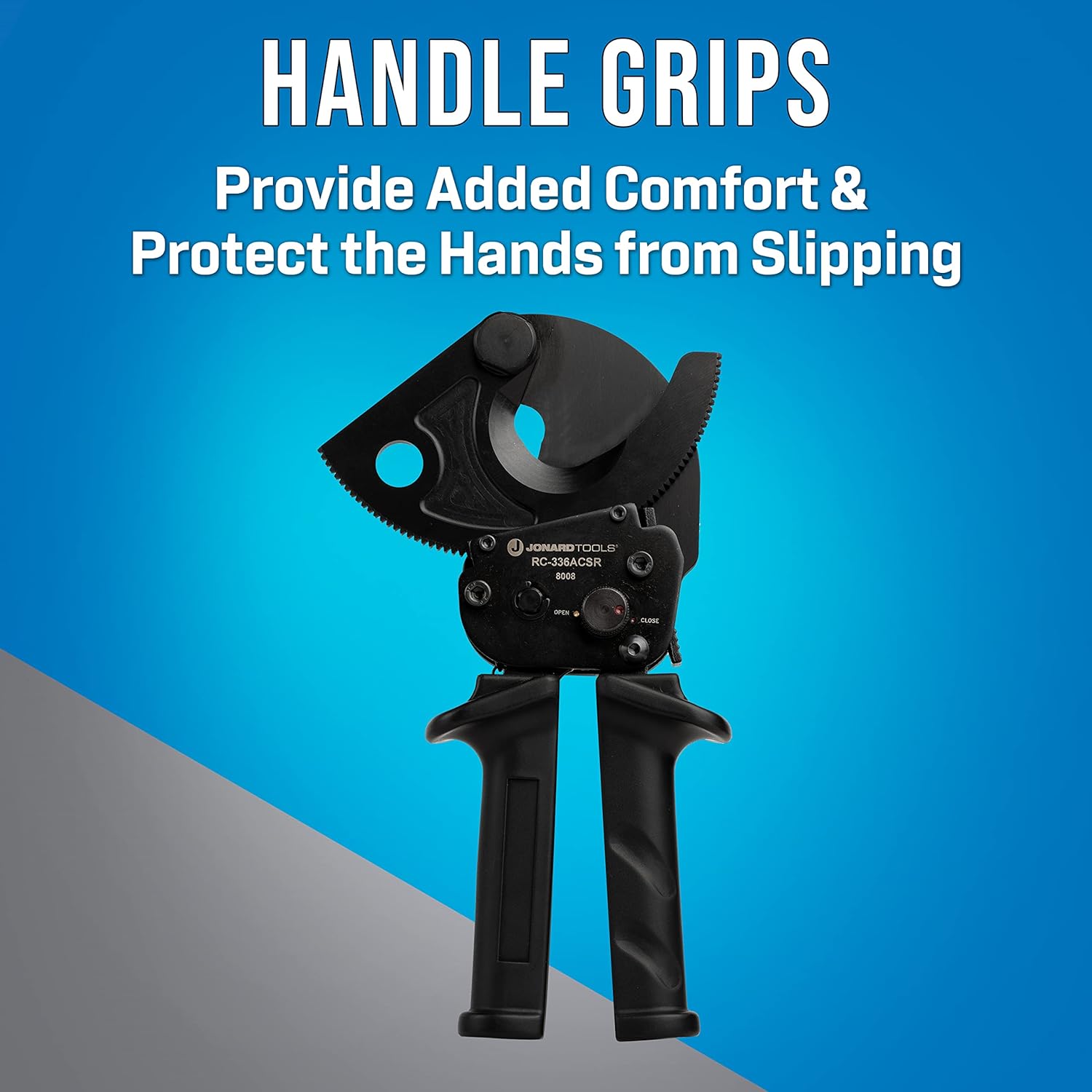 Designed for heavy-duty use, This cable cutter is designed to cut 336 MCM (170 mm) ACSR, 400 MCM (202 mm) copper, or 600 MCM (304 mm) aluminum cables, and most cables up to 30mm in diameter. This cable cutter features the following: Rugged design with long-lasting cutting blades Ratcheting action with ball bearing design reduces stress on hands. One-click per squeeze maximizes cutting force. Tool lock to keep handles closed when not in use Easy blade release if the tool is stuck or needs to be repositioned Tool grips provide added comfort and have built-in guards to protect the hands from slipping