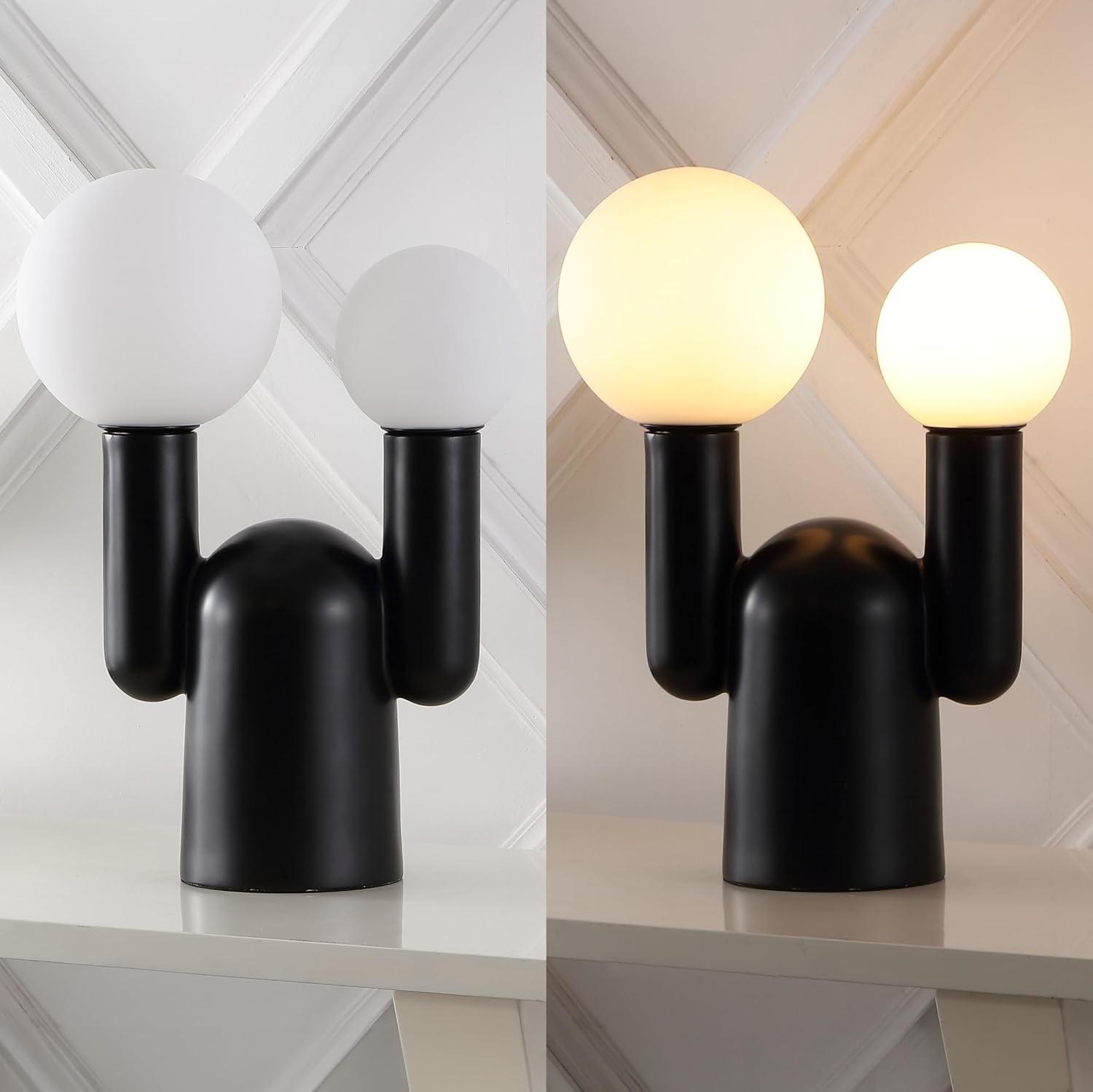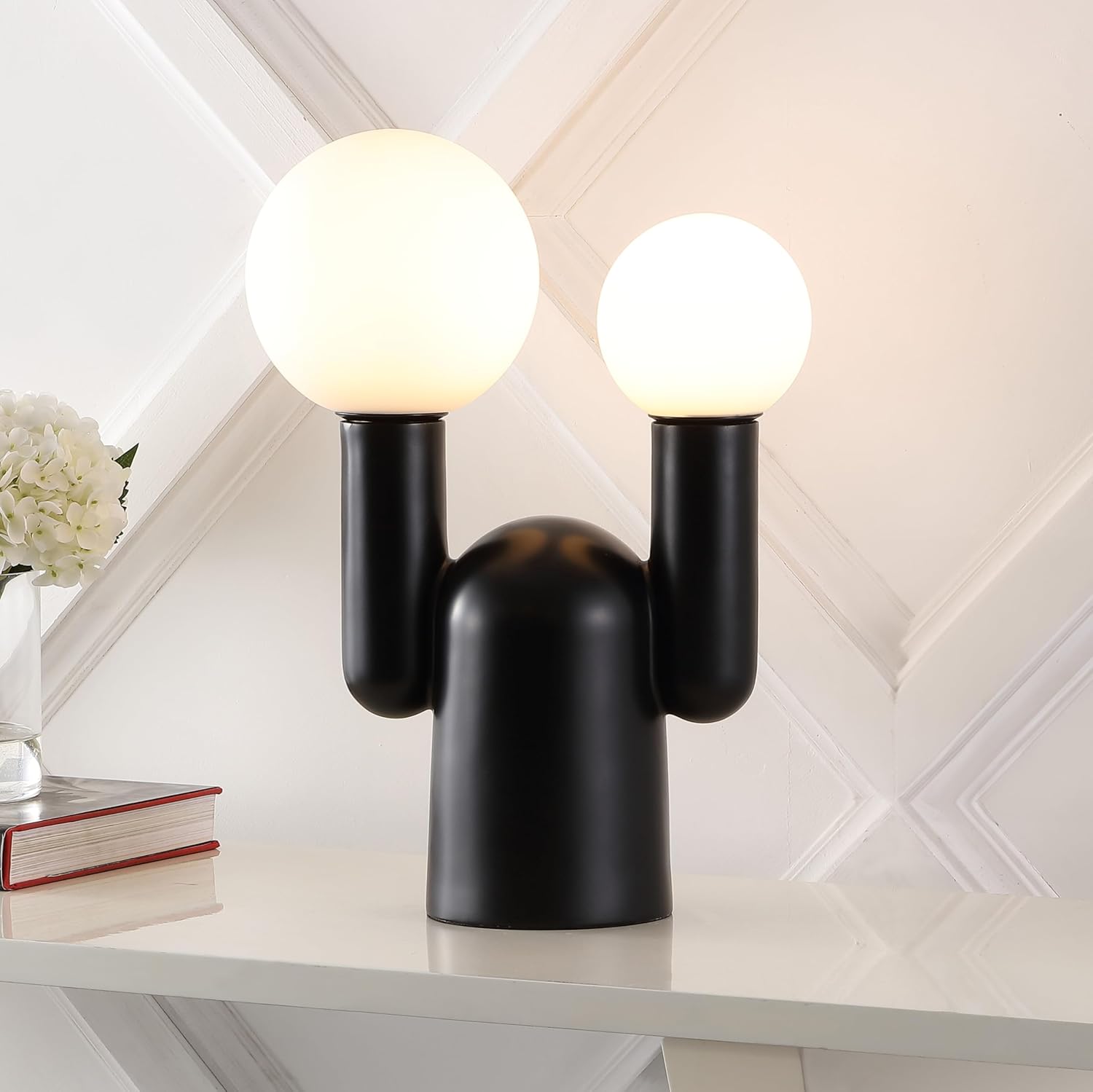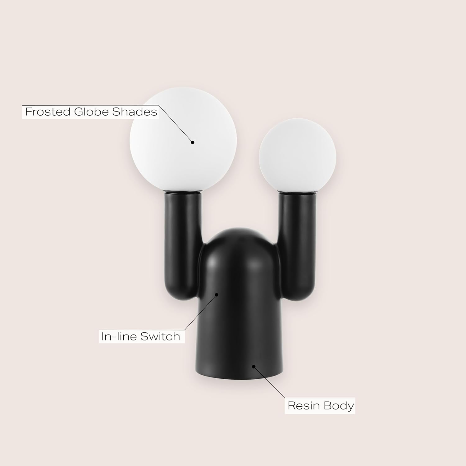 Minimalists and mid-century modern collectors love the groovy look of this 2-light table lamp. The bold design is versatile enough for the living room, bedroom, or office. Frosted globes soften the bright LED bulbs for soft ambient light.