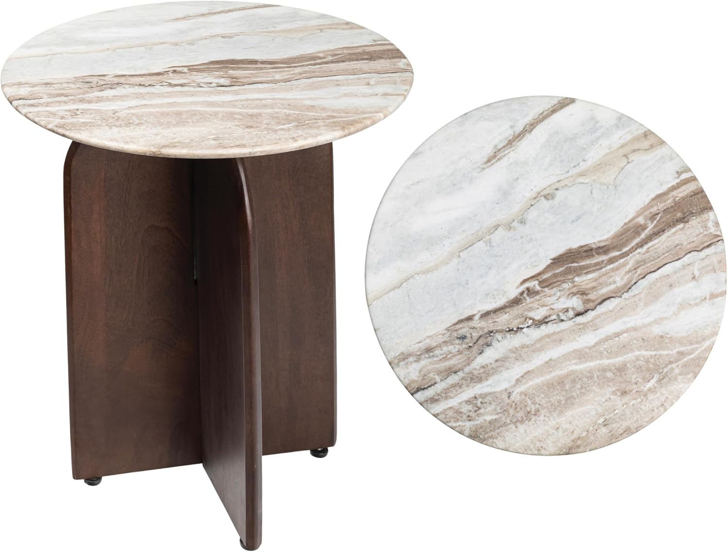 This small round table combines a minimalist silhouette with rustic materials in the perfect table to complement a club chair. It features a solid marble top set on a mango wood base for a unique blend of natural textures. Use this table to create a bedroom reading corner, or set a pair of them in front of a living room sofa as drink tables.