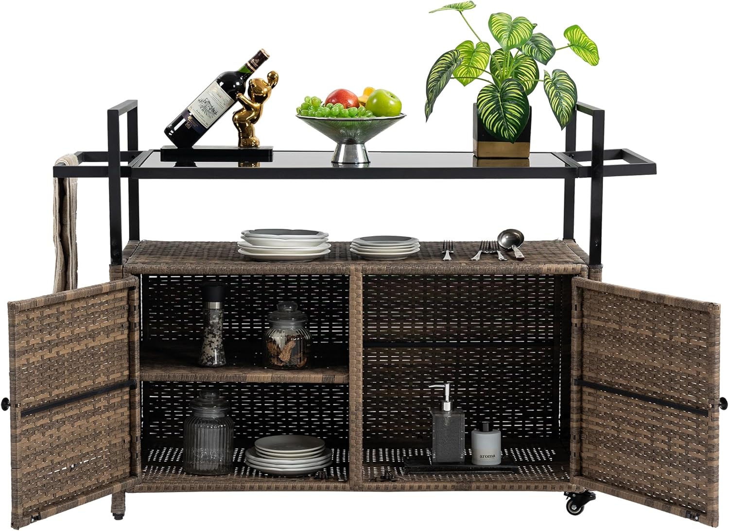 This stylish wicker bar cart features a smooth glass top and 360-degree rolling wheels, ideal for serving drinks and snacks outdoors. It combines durable rattan construction with a sleek modern look, perfect for patio, backyard, garden or poolside gatherings and daily outdoor use.