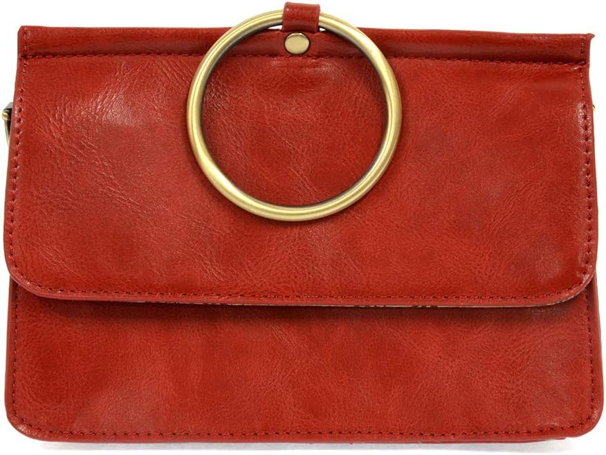 Put a ring on it! Perfect for your next night out, this cute bracelet bag looks great with your fav jeans or slinky dress! With multiple compartments, it is just the right size to hold all your essentials. Wear it on your wrist with the metallic ring bracelet, carry as a clutch or wear as a crossbody with the detachable shoulder strap. Product Details 6″ high x 8.25″ at widest point x 3.5″ deep Tapers up to the top point Adjustable and removable crossbody strap: 20″- 25″ 3″ diameter of ring that can be used as a handle Magnetic snap front closure Two interior open compartments One interior zip closurer compartment One interior zip closure pocket Brass plated hardware Printed Lining 100% Vegan leather (polyurethane)