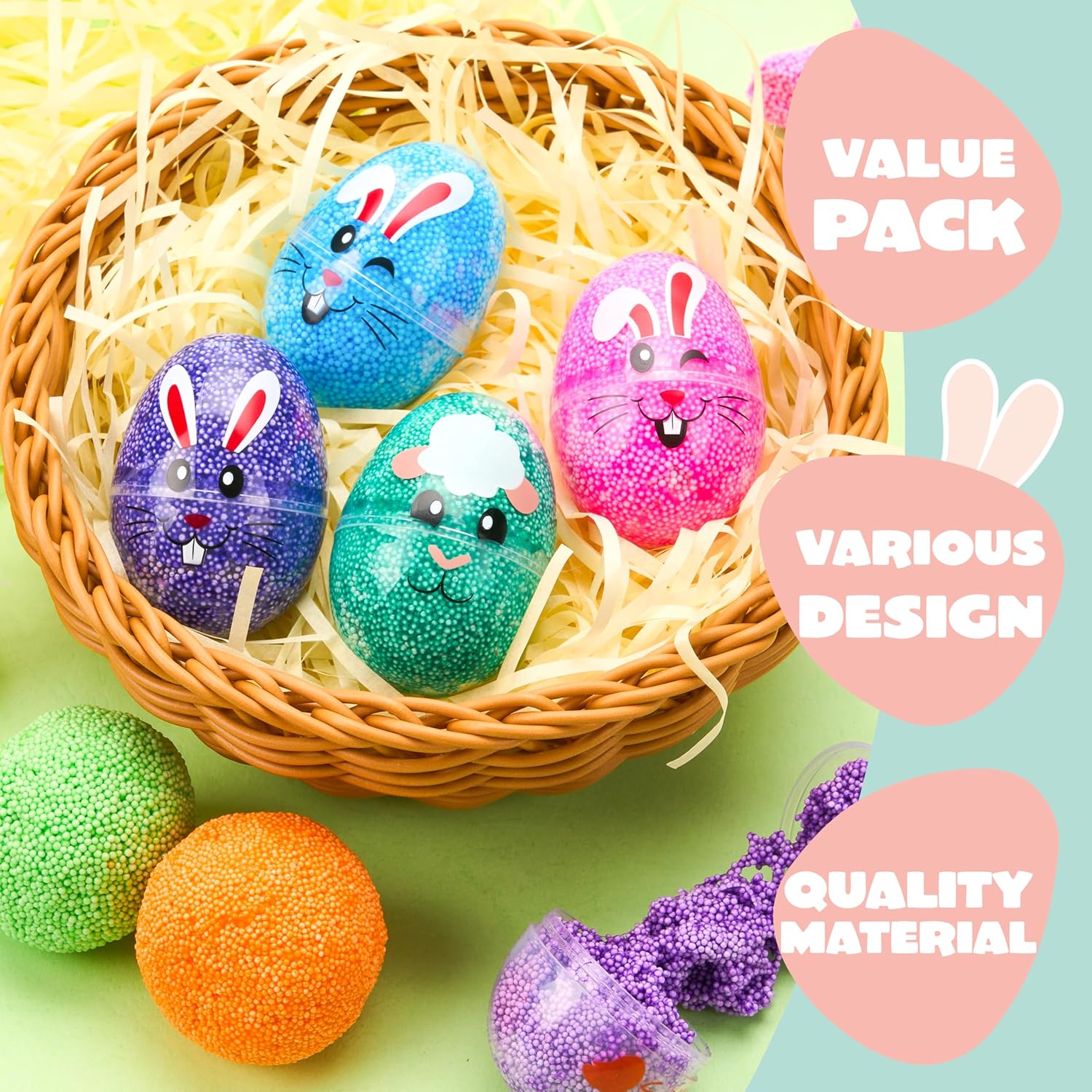 | Included Components | Easter Eggs with Foam Squishy Toys |