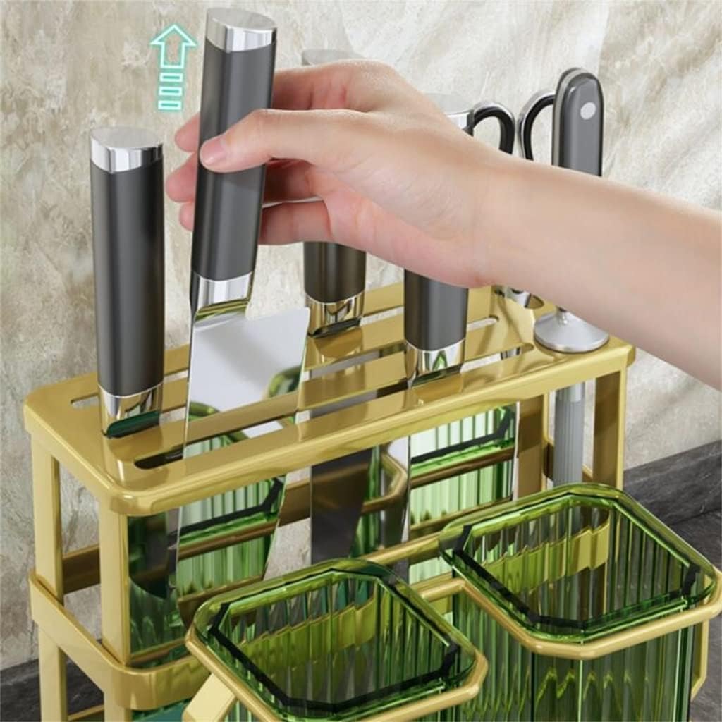 storage rack brighten up , wall hanging and countertop are availableReasonable partition, so that the kitchen utensils neat and orderly, with chopsticks and spoons area, area, draining area, easy to useload-bearing and stable without fallingBoth countertop/wall-mounted can be perforated, no punching dual-use:Tool holderMaterial: MetalPackage: storage rack*1Warm tips: the product may have color differences due to color rendering problems, please prevail in kind.Please do not close to the fire source or placed in a high temperature environment to avoid product deformation.for home kitchen, restaurant, steak house, camping, rv, outdoor and more.Brown knife block without knives is consist of heavy duty iron and quality nature wood
