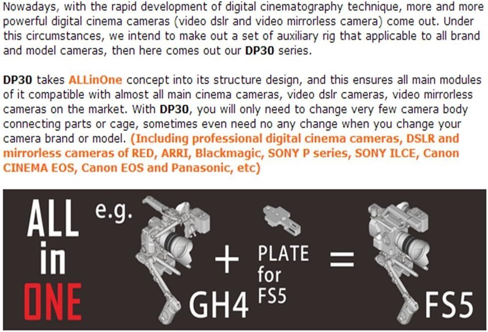 JTZ DP30 Camera Cage Standard Set is fully compatible with all SONY PXW-FS7, contains as follow: 1.Camera Cage Module: (Specialized Module) JLA-1 JTZlink Module × 1 JTZlink Module Mounting Plate x 1 Support C5 CCUPS Power Supply x 1 2.Baseplate Module: (Universal Module Fit For All Cameras/Camcorders) 15mm Standard Base Plate × 1 Mounting Adapter for VCT-U14 Tripod Plate x 1 5" Dovetail Plate for 15mm Rod × 1 Lens Adapter Supoort × 1 Lens Supoort × 1 15mm Aluminum Rod (Length 250mm) × 2 Flange for 15mm Rod × 2 3.Handle Grip Module: (Universal Module Fit For All Cameras/Camcorders) Standard handle grip(with cap) × 1 (Kindly Note: The grip is allowing use with the original grip simultaneously, and maintain the all of the original function on each other.) Adjustable Extension Arm Handle Grip × 1 Double-sided Flange Rod × 1 Handle Bi-directional Mounting Screw × 1 4.Shoulder Bracket Module: (Universal Module Fit For All Cameras/Camcorders) Standard Multifunctional Shoulder Bracket × 1 8" Dovetail Plate for 15mm Rod × 1 Adjustable Detachable Shoulder Holder for Locking Buckle × 1 15mm Aluminum Rod (Length 100mm) × 2 Several Spare Wrenches and Screws