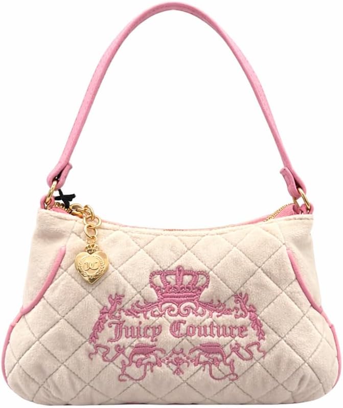 Add a touch of feminine charm to your everyday style with this delightful Juicy Couture mini shoulder bag wristlet in powder blush. The quilted design features the iconic Juicy Couture logo and crown embellishment in elegant pink embroidery, creating a luxurious aesthetic. This compact bag measures 8 inches wide, 5 inches high, and 1 inch deep - perfect for carrying your essentials while maintaining a sleek profile. The soft pink leather-like material is complemented by pink trim and a coordinating shoulder strap for versatile carrying options. A charming heart-shaped charm adds an extra touch of whimsy to this sophisticated accessory. The bag's size makes it ideal for both casual outings and evening events when you want to travel light but still make a style statement. The wristlet feature offers additional carrying convenience, while the main compartment provides space for your phone, cards, and daily necessities.