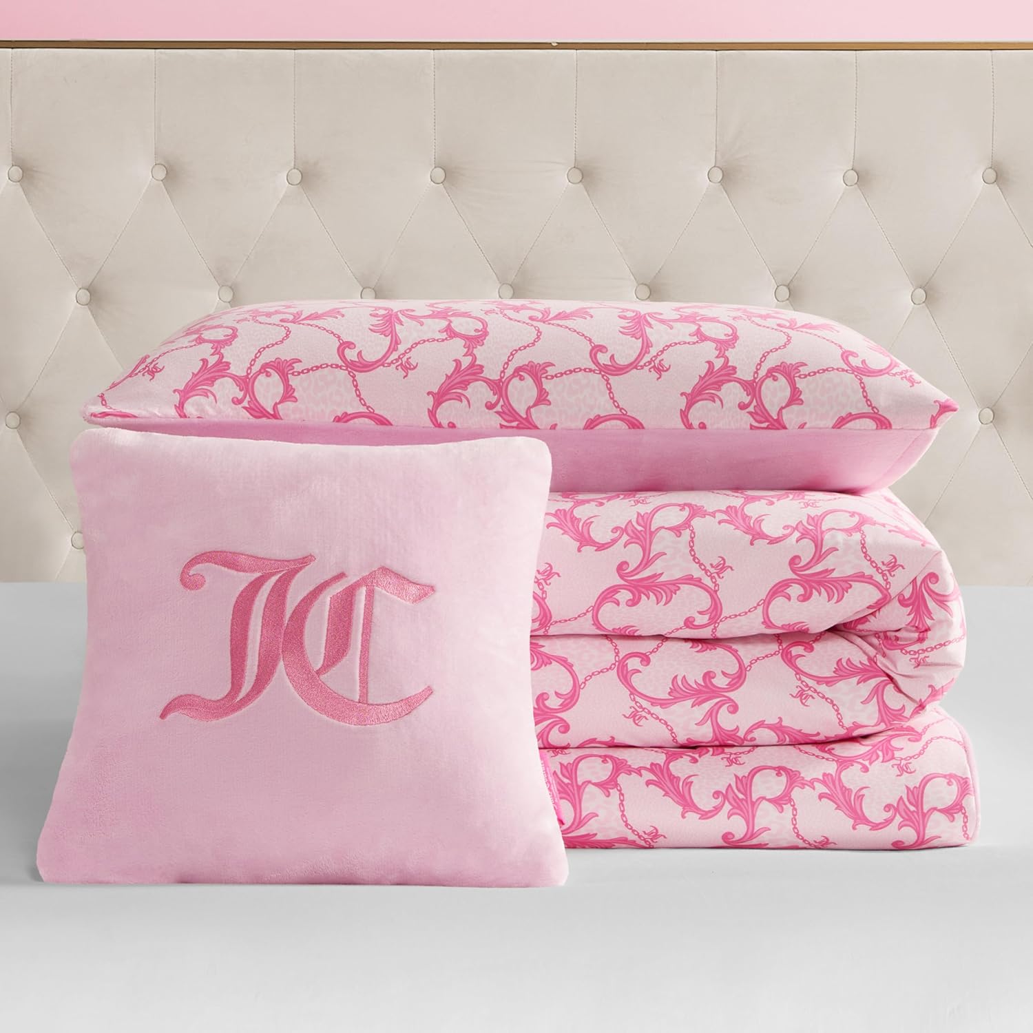 Transform your bedroom into a chic retreat with this Juicy Couture reversible bedding set, featuring two stylish looks in one. Crafted from luxuriously plush soft fabric, it delivers cozy comfort while showcasing signature glamour. Complete with a coordinating decorative pillow, this set adds the perfect finishing touch for a polished, fashion-forward bedroom.