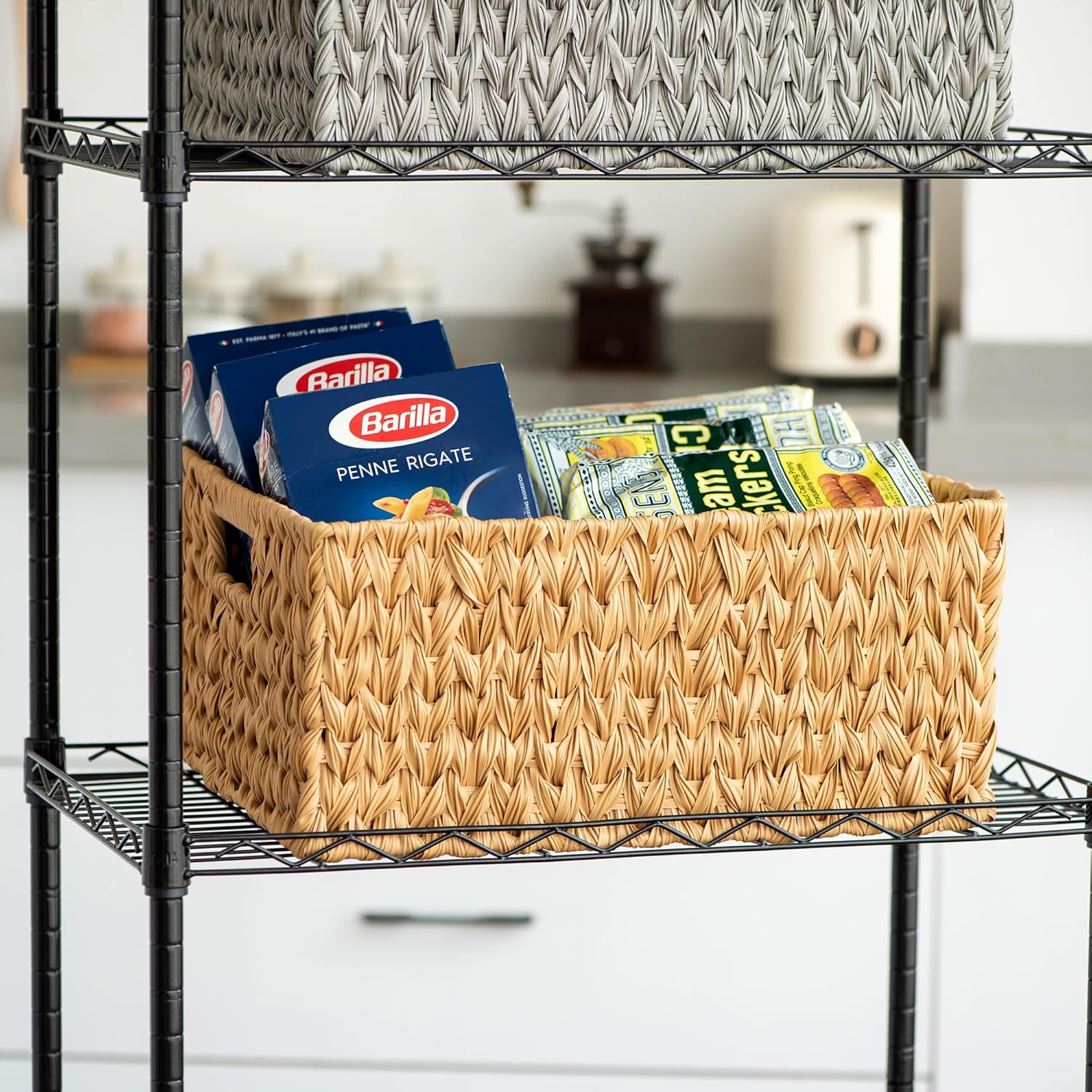 Suptinwear Jumbo Large Plastic Wicker Basket, Waterproof Rattan-Look Storage Basket with Handles, Extra Large Rectangular Woven Basket for Bathroom, Shelves, Closet & Laundry, 16.93"D x 12.99"W
