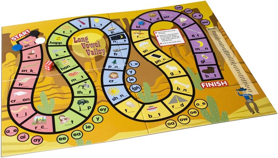 This set of educational games and activities is designed for teaching vowel sounds. Children will love playing and practicing with vowel sounds to win each game. After mastering these games, children will be ready to progress to 6 spelling games. Contains: 2 board games, 2 matching games, word puzzles, die, counters and spinner.