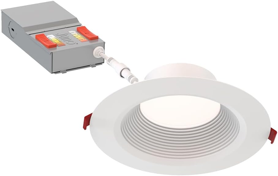 Upgrade your ceiling lighting with the Juno Wafer Deep Regressed LED Downlight, featuring a canless design for effortless installation without the need for traditional housings. Designed for versatility, the 6-inch recessed light offers a switchable white feature that allows you to toggle between five color temperatures (2700K Soft White, 3000K Warm White, 3500K Neutral, 4000K Cool White, 5000K Daylight) to perfectly match any room's atmosphere. With selectable lumen outputs of 800, 1050, or 1300 lumens, this LED downlight suits various ceiling heights and lighting needs throughout your home. This technology gives distributors, contractors and homeowners the ultimate in flexibility by providing the equivalent of 15 static fixtures in one. The matte white deep regressed trim provides excelent glare control, quality of light, and efficiency, while the wet location rating ensures safe use in bathrooms, showers, and covered outdoor spaces. Engineered for fast and simple installation, this downlight fits confined spaces like soffits, closets, stairwells, and hallways. Its polycarbonate lens ensures even illumination, while triac dimming down to 10% lets you set the perfect ambiance. IC Rated – fixture and driver box can be installed in direct contact with insulation. ENERGY STAR and CSA certified, and backed by a 5-year warranty, Juno 6 Inch Deep Regressed LED Lights provide a reliable, energy-efficient solution for modern residential lighting.