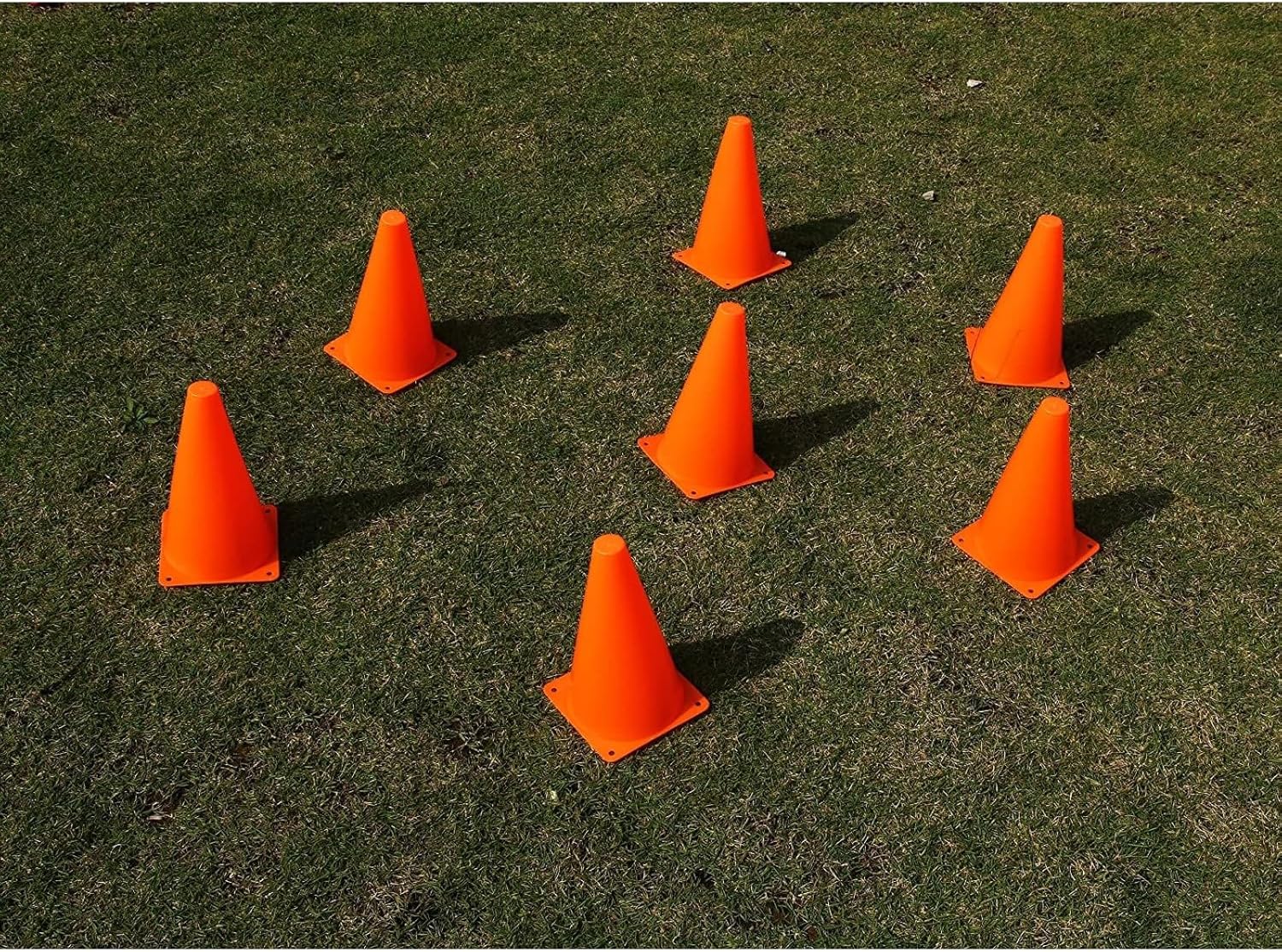 9 Inch Plastic Traffic Cones - Orange Durable Sports Training Cones - 12 Pack These 9-inch orange plastic traffic cones are expertly crafted from robust polyethylene vinyl plastic, ensuring both durability and stability across a multitude of applications. As outdoor activities increase during the fall season, these cones are essential for various training exercises, such as agility training and driving lessons. Their vibrant orange color enhances visibility, making them ideal for sports training and traffic control in parking areas. Each cone is equipped with four perforated holes at the base, allowing for secure attachment to different surfaces, making them suitable for motorcycle practice drills and parallel parking exercises. With dimensions measuring 5.5 inches in width and 9 inches in height, these cones are versatile for both personal and professional use, such as driving lesson kits with cones and agility training sessions. Commonly used by sports enthusiasts, driving instructors, and educators, these cones are effective as practice cones, agility cones, mini traffic cones, and cones for games in various educational and athletic contexts. The bulk set of 12 cones provides ample resources for setting up soccer cone drills or driver's education courses. Designed for functionality, these cones can also be used for creating pylons in driving practice and as integral components in parallel parking practice kits. Their sturdy construction withstands repeated use, offering a reliable addition to any training equipment collection. Whether utilized for sports training, traffic management, or educational purposes, these plastic traffic cones meet the diverse needs of individuals and families seeking dependable tools for everyday tasks. They are particularly suitable as mini safety cones and mini colorful cones, enhancing any training session or practice area with their versatile and durable design.