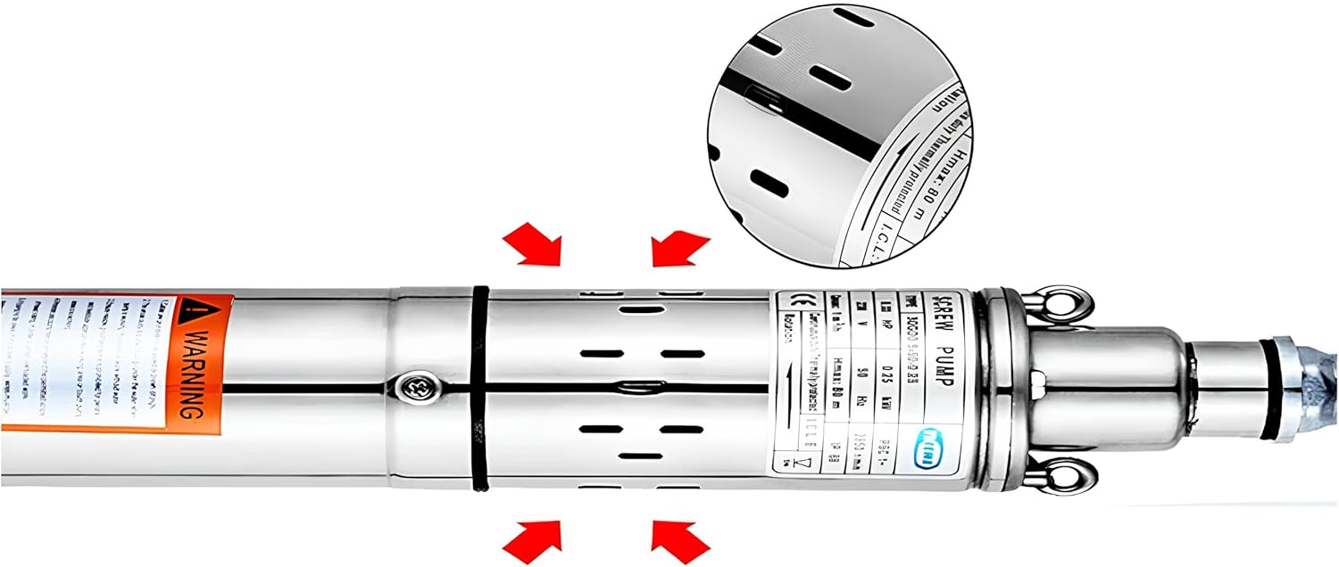 High performance submersible pump perfectly adapted to drill pipes. With its powerful motor, it can pump water up to 90-110-115 meters deep and transfer 1.8 - 2.6 - 2.8 tons of water per hour. To choose the right variation for your needs: The pump's patented impeller structure, which provides high pressure and flow rate with low power consumption, promises long-lasting use. The stainless steel wire mesh system prevents sediment and debris from outside, thus ensuring efficient operation. The motor with thermal protection increases safety by automatically stopping the pump in abnormal situations. High quality rotor and stator components with balanced and precise structure. Recommended for new wells or sandy environments, you can help extend the service life of this pump by wrapping a thin cloth or gauze around the suction part.
