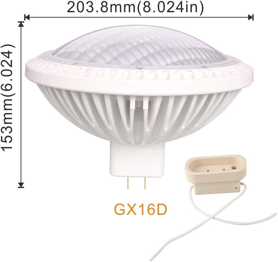 NSP 500W PAR64 Lamp Replacement Parameters : ◆Voltage: AC110-130v Dimmable ◆Power: 40W ◆Light source: LED 60pcs ◆Beam angle: 24° ◆Luminous Efficiency : 110LM/W ◆Lumen : 4100lm bright as 500w incandescent par64 ◆CCT: 4000K-4500K ◆CRI: >82 ◆Base: GX16D ◆Lamp body material: durable heat-conductive plastic with aluminum(8mm thickness) inside + PC cover ◆Size: Φ204MM*H150MM ◆Terminal: Mogul End Prong GX16D plug & socket Replace 500W halogen PAR 64 bulb ◆Net Weight: 1.24KG >Indoor lighting 500 watt par64 replacement ,120 volt 40w dimmable LED PAR64 with Mogul End Prong (GX16d) Base 4000K neutral white color , Narrow Beam Angle 24° Light Bulb , can be used in theater , stage, hotel hall lighting ... Warranty : 2 years Package including : 1x dimmable 40W LED par64 + GX16D Ceramic Socket