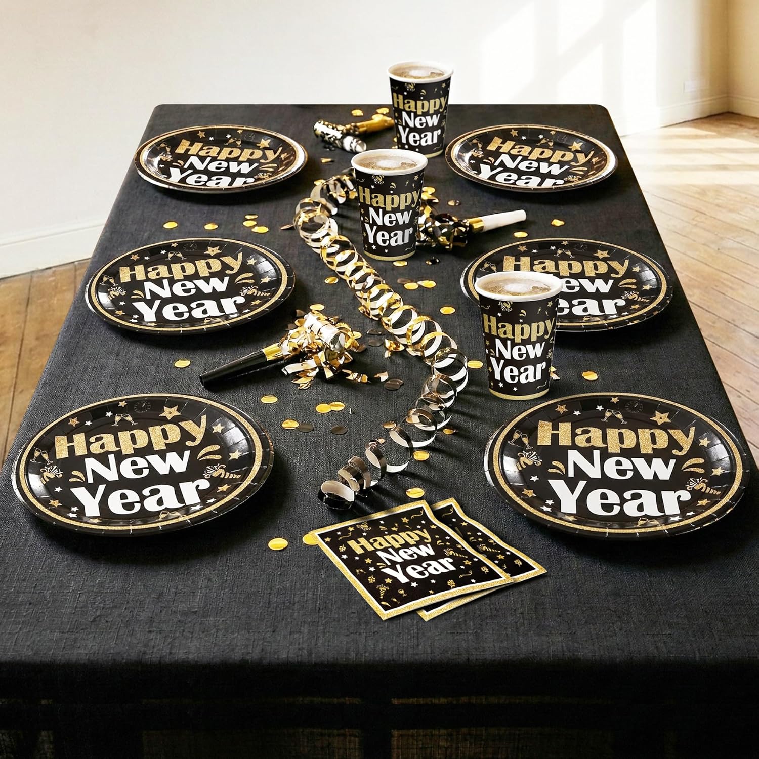 Celebrate New Year 2026 in style with this complete New Year Virtual Party Bundle designed to make hosting effortless and elegant. This bundle combines eye-catching decorative flair with practical tableware essentials, giving you a perfectly coordinated black and gold New Year celebration setup. Ideal for New Year’s Eve parties, countdown events, office gatherings, or family celebrations, it helps you create a festive atmosphere while saving time on party planning and cleanup. Whats in the Pack 1 pre-assembled Happy New Year glitter banner set with two strings spelling “HAPPY” and “NEW YEAR,” measuring approximately 10 feet in total length, made with gold glitter cardstock pennants, bold black lettering, and decorative bowknots. 25 large 9-inch Happy New Year paper plates. 25 small 7-inch paper plates. 25 themed New Year paper napkins. 25 disposable paper cups. This tableware set serves up to 25 guests and pairs seamlessly with the banner for a cohesive New Year 2026 party look. Suggested Uses Perfect for New Year’s Eve parties, New Year 2026 home celebrations, office parties, family gatherings, countdown events, buffet and dessert tables, photo backdrops, entryway décor, indoor or outdoor party setups, catering events, and stress-free hosting with quick and easy cleanup. Powered by BRND.ME.