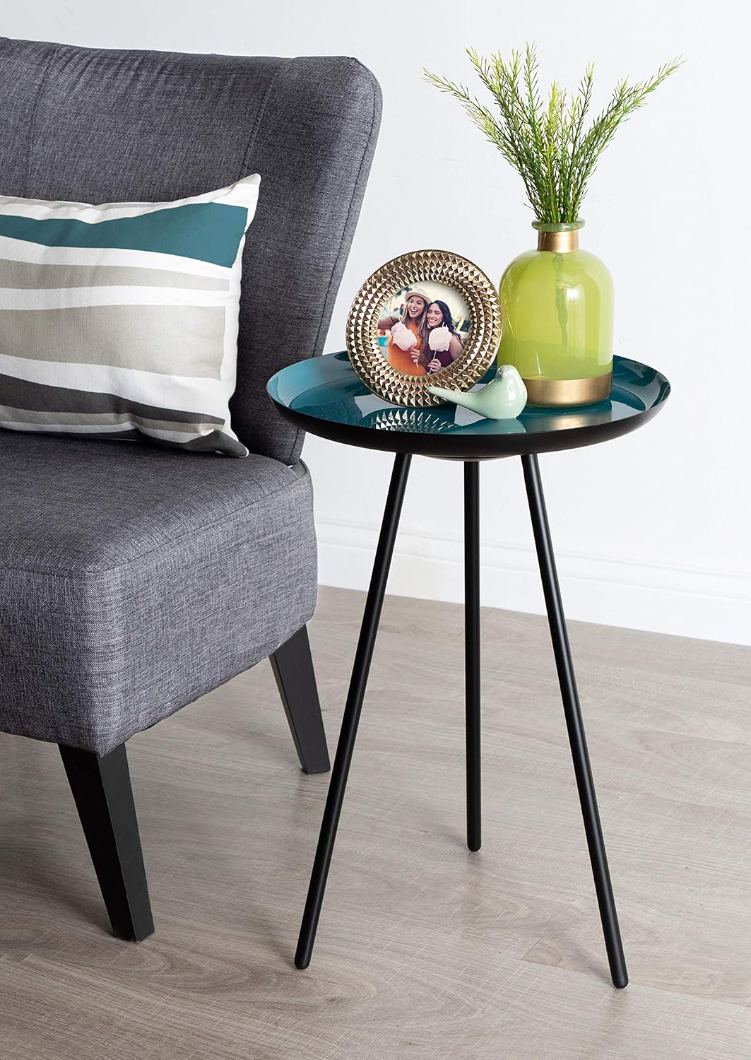 Embrace minimalist design and practical decor with this accent table from Kate and Laurel. The Laranya Round Side Table features a clean, simplistic design, with three legs and a saucer-like tabletop. The tabletop has a 15" diameter with a curved edge, perfect for use as an accent table, a plant stand, charging station, or serving tray. The metal material and hand-applied epoxy enamel tabletop elevate this table to top-tier, lasting quality craftsmanship. This table looks great in any modern living area in your home thanks to its two-tone finish: black on the metal frame and teal on the inner basin. Its versatile style makes it a simple, sharp accent in your living room, bedroom, bathroom, entryway, or kitchen. With its 22.5" height, you can use it next to a sofa, or as a catch-all for jewelry, keys, and makeup. Get ready to have a minimalist style in a matter of seconds with a three-step assembly: screw in the three legs to the pre-drilled holes at the base of the saucer tabletop.
