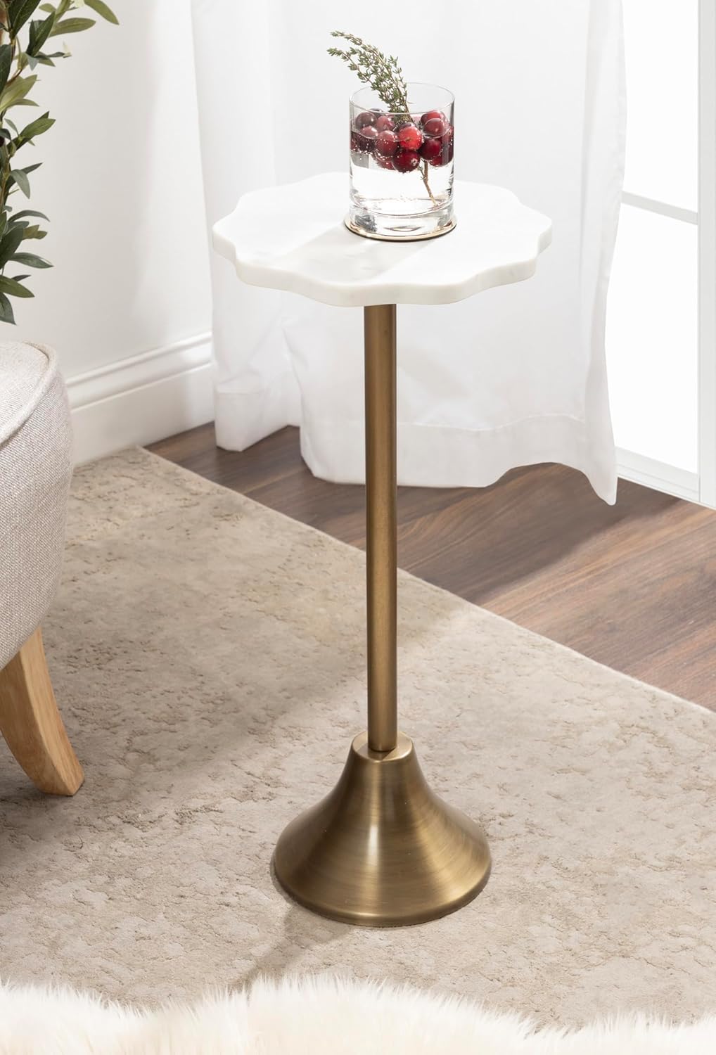 The charming Sanzo drink table makes a bold impression with its handcrafted contemporary style. The Sanzo table has a sophisticated design that draws the eye and captures guests' attention, featuring a trendy scalloped marble tabletop and a bell-shaped bottom. This version of the Sanzo offers a rich, natural marble surface paired with its traditional table base. This craftsmanship creates a distinct look from piece to piece in this collection, allowing your cocktail table to be completely one-of-a-kind. The table's base is made from an iron material featuring an antique brass base to provide an iconic aesthetic that echoes eras of decorative refinement. This elegant end table's overall dimensions are 10 inches wide by 10 inches deep by 23 inches tall, making it a fantastic addition to a couch, armchair, or entry. The Sanzo looks great, whether it's serving drinks on coasters, acting as a catch-all for small household items, or displaying your decorative style. The small size of this table makes it fantastic for small spaces or corners of the home. Assemble the beautiful Sanzo pedestal table in a matter of minutes with a simple two-step assembly process.