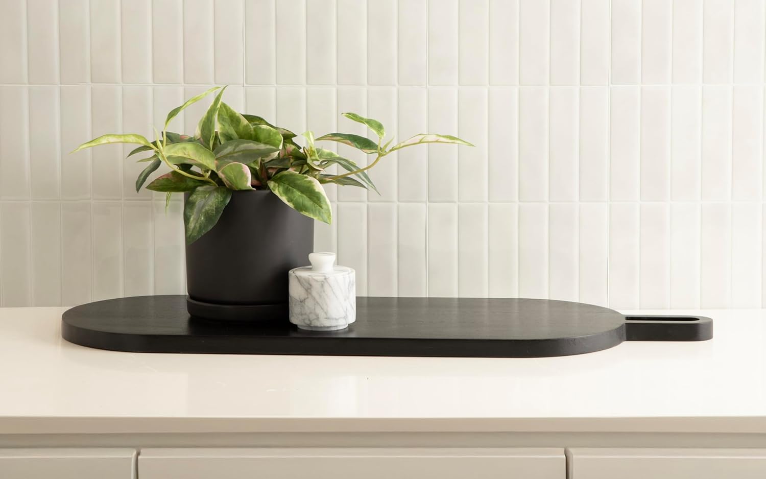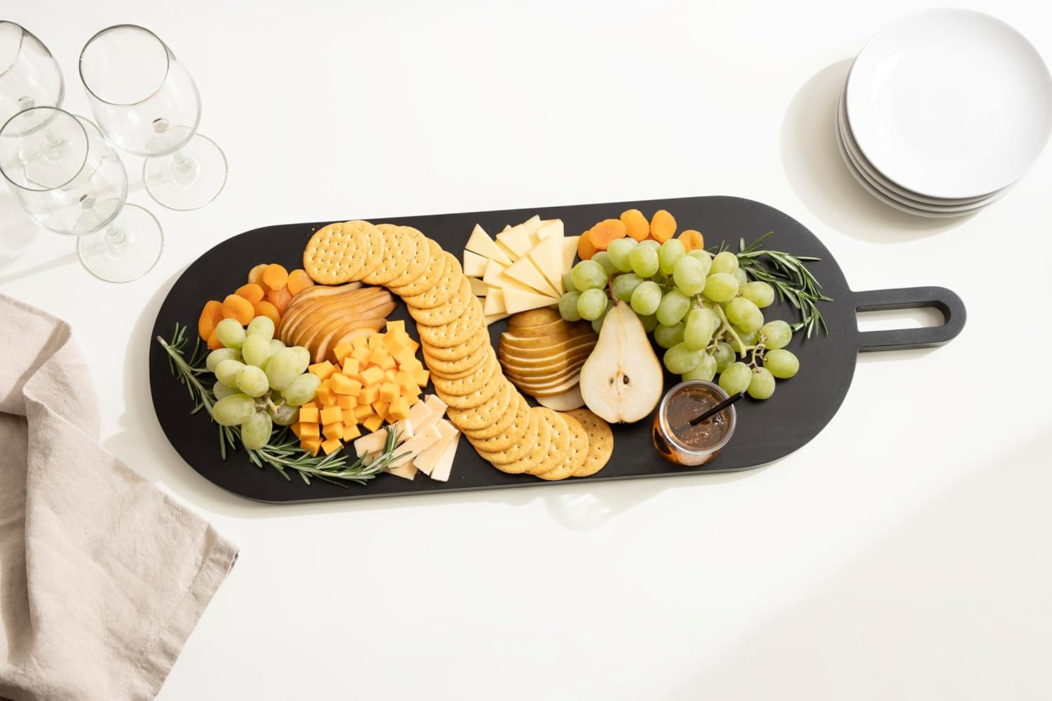 Introducing the Kate and Laurel Staven capsule serving board, a must-have addition to your kitchen or dining area. Crafted with meticulous attention to detail, this large cheese board is designed to elevate your culinary presentation and provide a stylish way to serve and display your favorite appetizers, charcuterie, cheeses, and more. The modern black finish of the board exudes a modern and sophisticated aesthetic that seamlessly complements any decor style, from contemporary to rustic. Constructed with solid mango wood, this charcuterie board is not only visually appealing but also highly durable and long-lasting. The Staven serving board boasts a thoughtful design with its convenient handle, allowing for easy carrying and serving. Whether you're hosting a casual gathering or an elegant dinner party, this board makes it effortless to present your culinary creations in a visually stunning manner. This sizable charcuterie board measures 30 inches wide by 10.5 inches deep, offering versatility and options for different occasions. Beyond its functional use, this serving board can also serve as an exquisite decorative piece for your kitchen or dining room. Display it on your countertop to add a touch of natural beauty and artistic flair to your space.