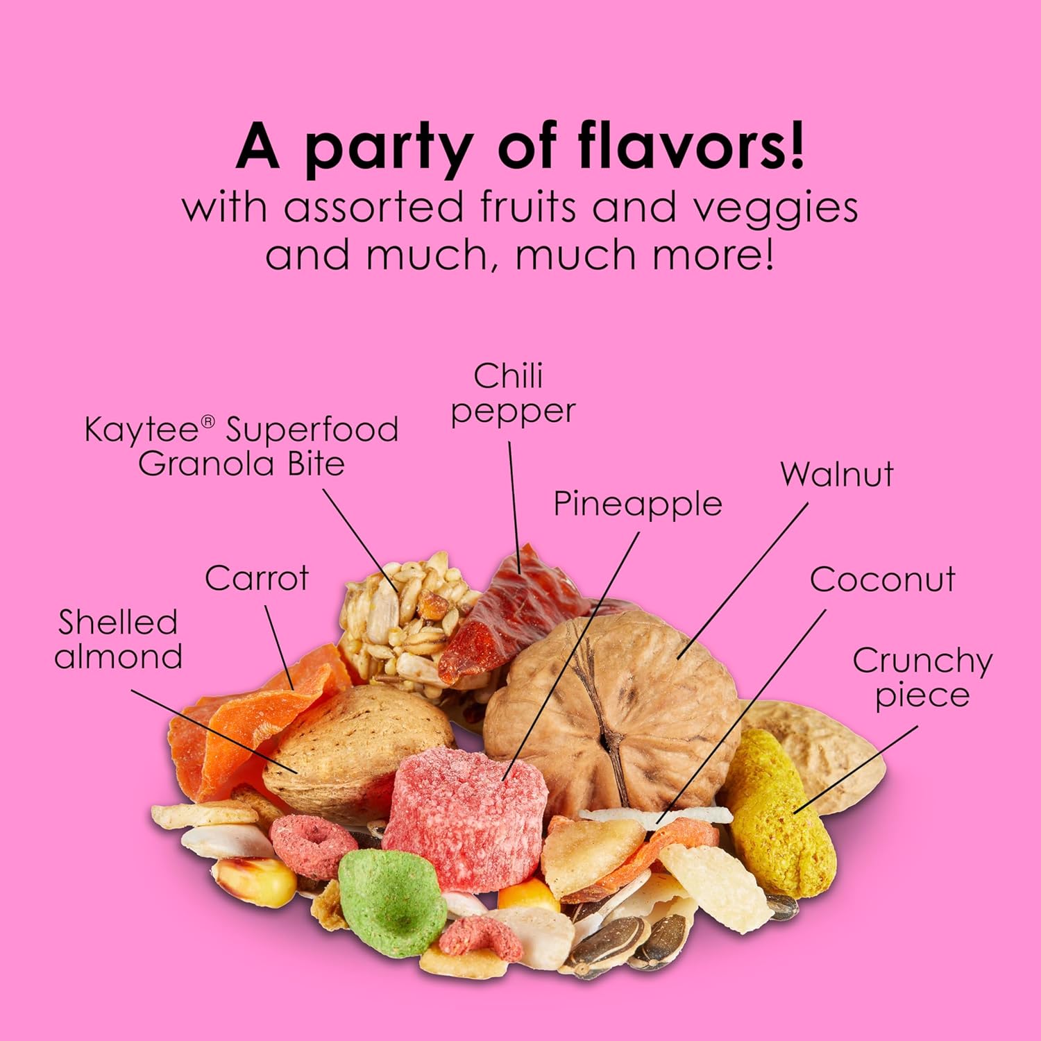It’s a super-sized party at feeding time with Kaytee Fiesta Big Bites! Made especially for large-billed birds, Kaytee Fiesta Big Bites Macaw Food is a fun-filled, complete diet your bird will love, all while getting the nutrition they need to thrive. Filled with an exciting variety of ingredients, shapes and textures, this bird food blend engages your pet at feeding time and stimulates their natural foraging instincts to keep them from boredom. Kaytee Fiesta Big Bites Macaw Food was formulated by a pet bird nutritionist so that your macaw is getting necessary nutrition in every bite. This is a nutritionally fortified gourmet diet made of a premium blend of fruits, vegetables, seeds and grains offering maximum variety and stimulation for your pet. While they’re loving their meal, you’ll love watching them work through the party of ingredients, shapes and surprises. This blend supports the digestive, brain, skin and feather health of your pet as part of promoting a healthy and happy bird. Sharing your life with a pet is more than just enjoyable, it’s enriching – and Kaytee believes feeding time can be the same. With over 150 years of nutritional experience, it’s no wonder why Kaytee is at the heart of every healthy feeding routine.
