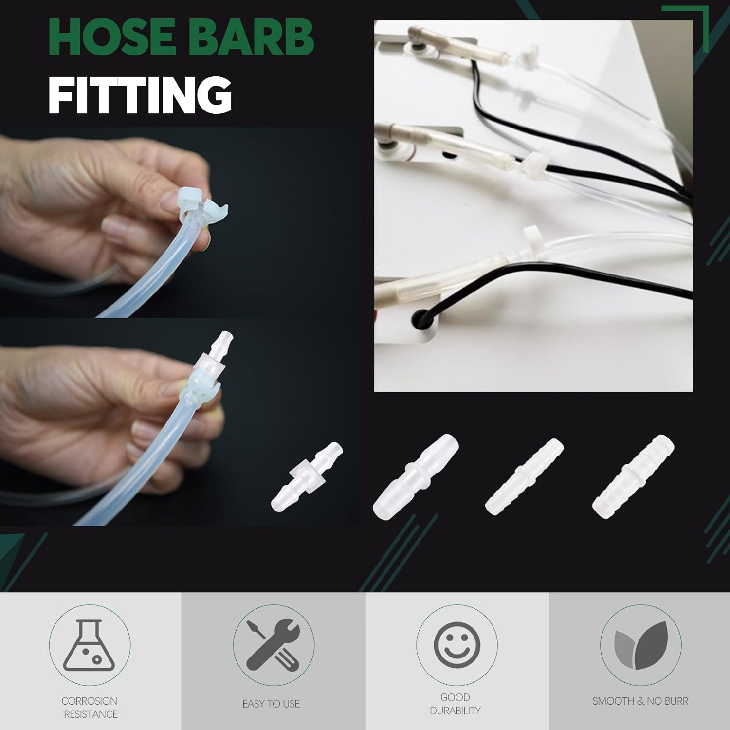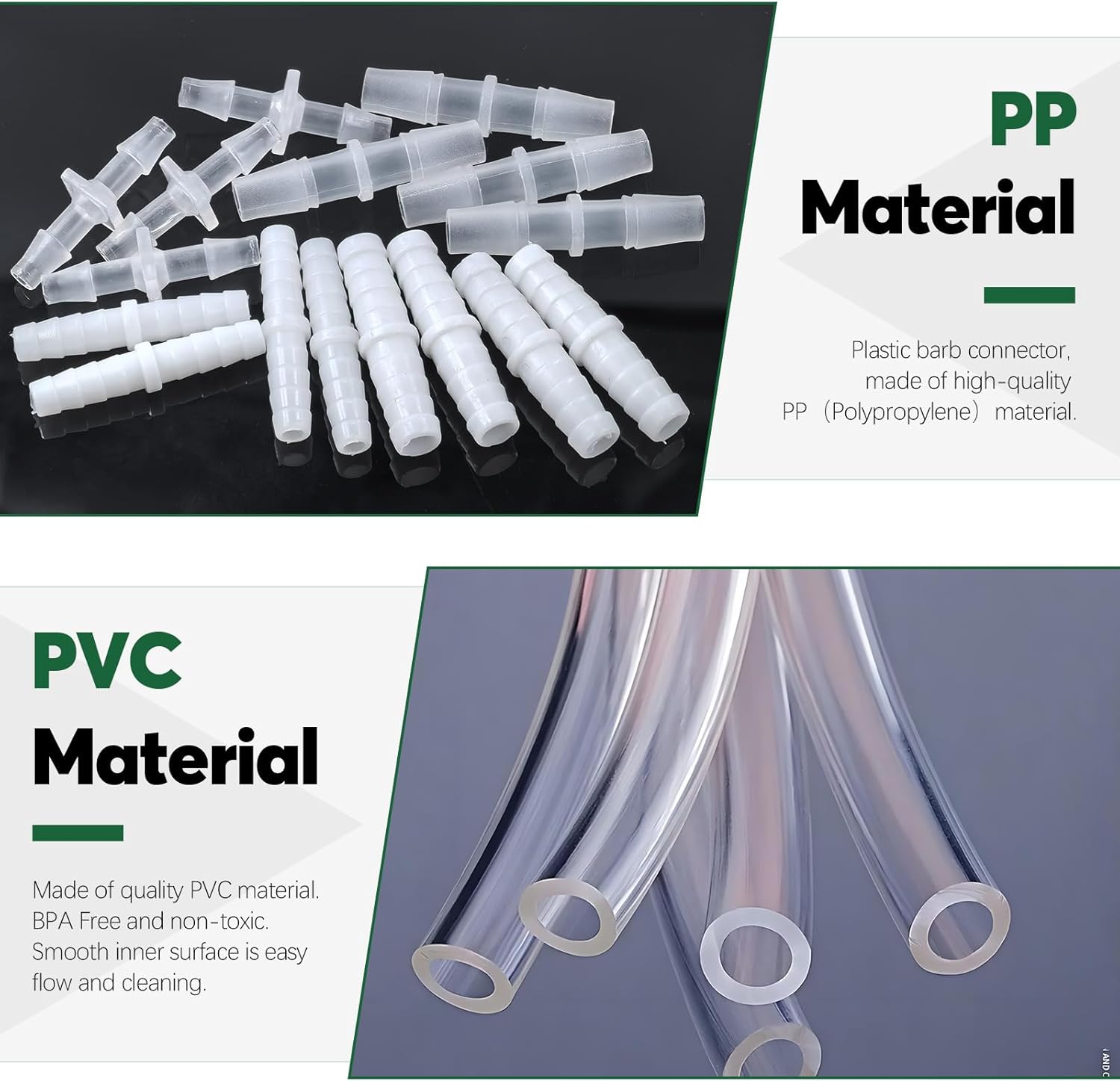 [Product Description]: Keadic 25Pcs Hose Barb Fittings & Clear Tubing Assortment Kit, 5.6MM 6MM 7.9MM 8MM Barb Reducer, 3M/9.84Ft Plastic Tube Hose Set Pipe Connectors Joint Mender Adapter for Home Repair ◆ Product Specification: √ Material: PE, PP √ Color: Clear, White √ Size: Please refer to the second picture. ◆ Product Feature: √ Excellent Material: Made of high-quality plastic, it has good corrosion resistance, impact resistance, and durability, ensuring long-term stable use. √ Rich Sizes: Our barb reducers come with 6 sizes, and flexible PVC tubing is 3m/9.84ft in length, also with 4 sizes to choose, which can meet your different using purposes. √ Leakage Prevention: The thorny end tightly grips the PVC tubing without leakage, making it easy to operate and practical. ◆ Package Contain: 4Pcs -------5.6MM Hose Barb Fitting 4Pcs -------6MM Hose Barb Fitting 4Pcs -------7.9MM Hose Barb Fitting 4Pcs -------8MM Hose Barb Fitting 3Pcs -------Clear Tubing(ID 6mm, OD 8mm) 3Pcs -------Clear Tubing(ID 7mm, OD 9mm) 3Pcs -------Clear Tubing(ID 8mm, OD 10mm) In Total 25Pcs