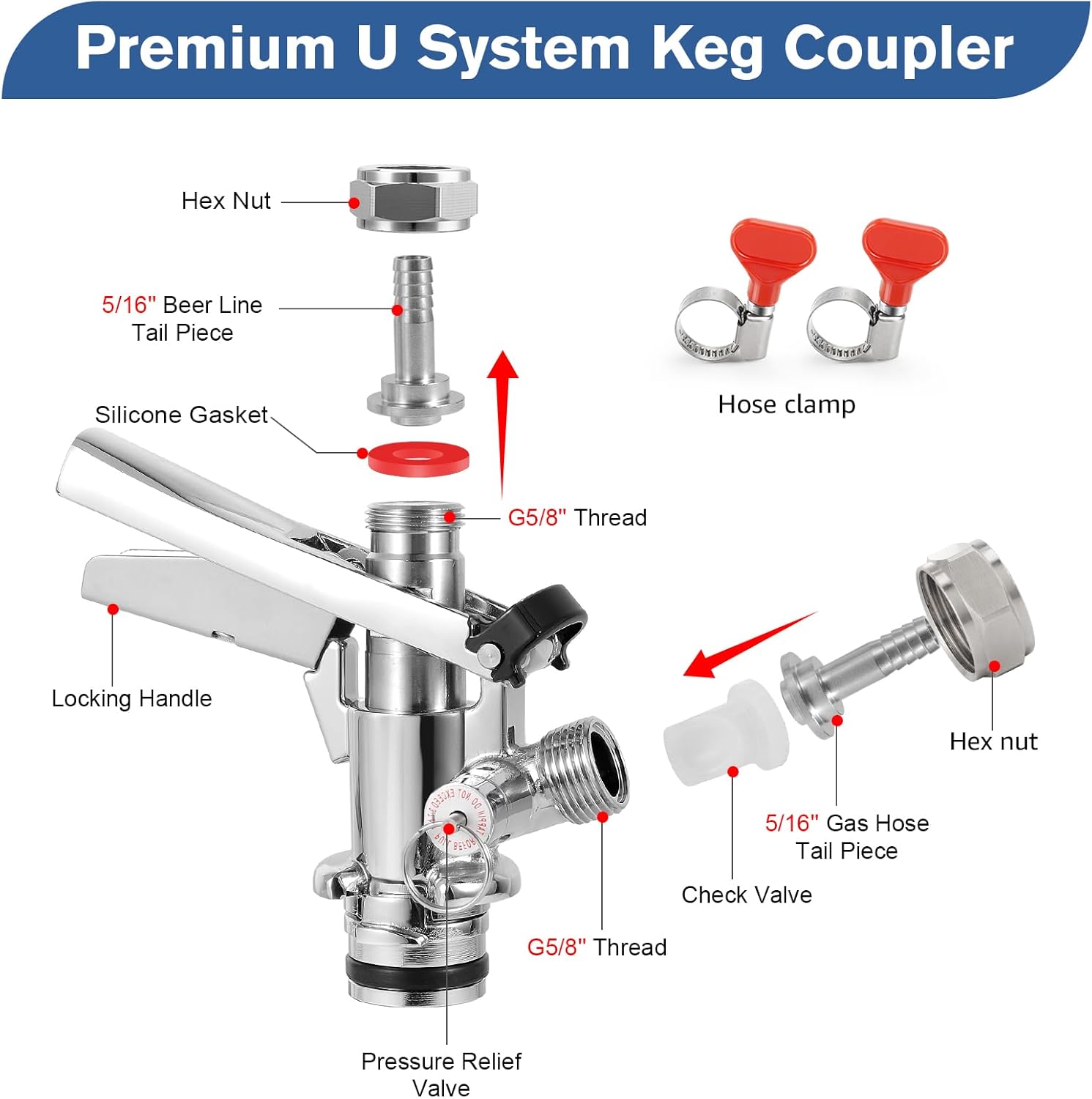 Dbgogo concentrate on producing and selling high-quality homebrew products, you can get more surprise products by search "Dbgogo. Dbgogo keg coupler is compatible with some European type keg valves, allows you to easily enjoy your favorite domestic beer straight from the keg, add vitality to your party, picnic, bar, hotel, restaurant and home brewing system! Features: The u type keg coupler has a stainless steel body and stainless steel probe ensures that it will not wear away for a long time and keep your beloved beer an original taste. The white check valve prevents beer backflow and the o-ring sealing gasket can effectively avoid air ingress and prevent liquid leakage. Premium keg coupler will not cause CO2 leakage when tapped, the safety pressure relief valve stabilizes the carbonated pressure at the same time. How to work: Pressurized gas in co2 tank flows into the side of the keg coupler through a gas line. The beer flows out through a beer line attached to the top of the keg coupler. How to check whether the u-system keg coupler leaks or not? The best way to check is to spray it with soapy water when it is under pressure and look for bubbles. What will you get: 2* washeres 2* check valves 2* hose clamps 2* G 5/8'' hex nuts 1*u type keg coupler 1* 5/16'' gas hose tailpiece nipple 1* 5/16'' beer hose tailpiece nipple