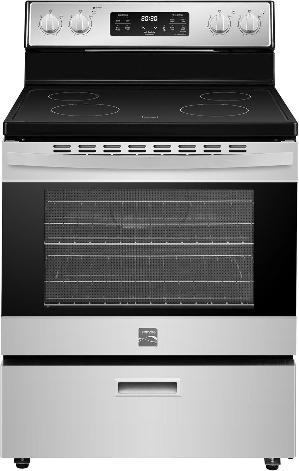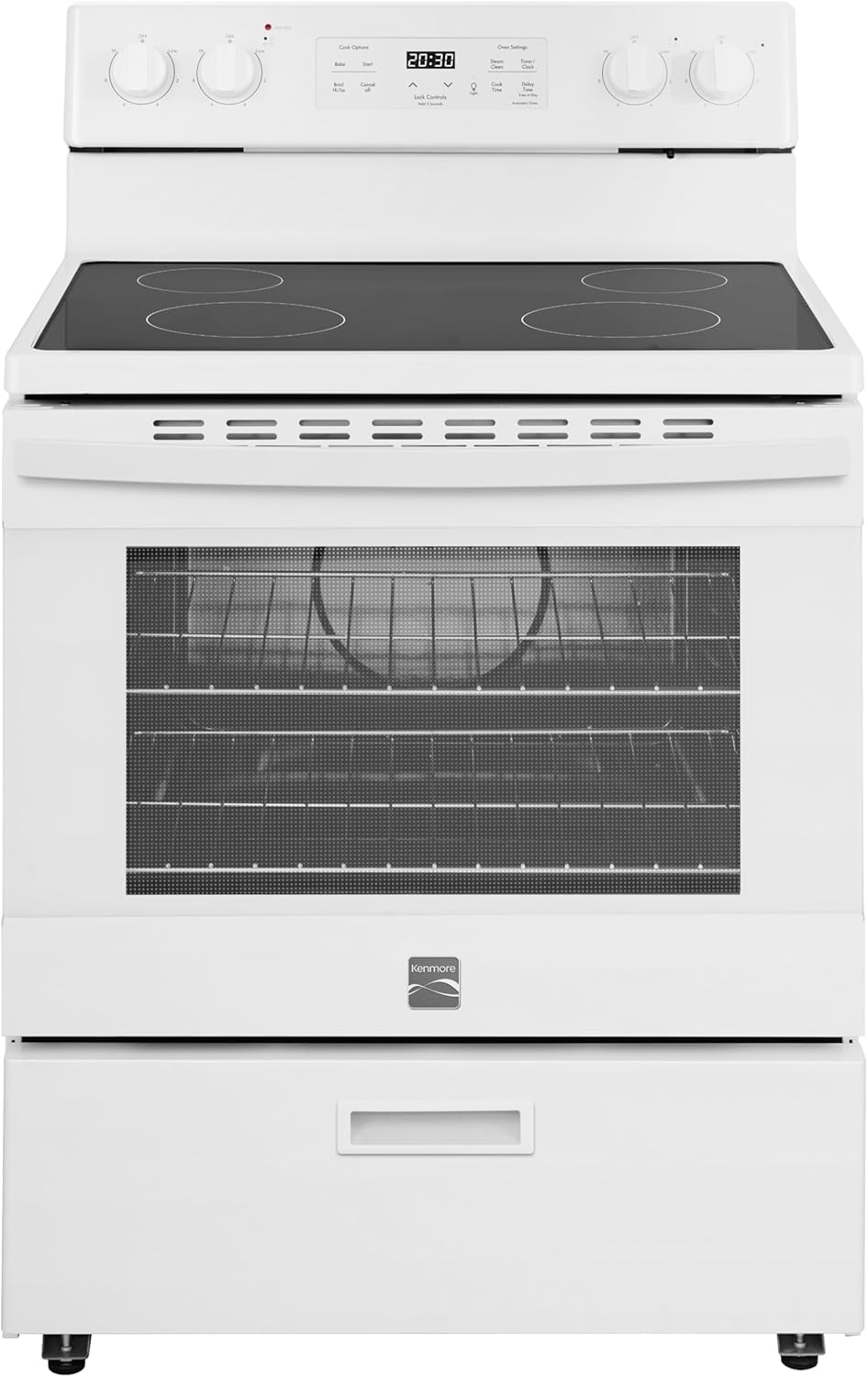Upgrade your kitchen with the Kenmore 5.2 cu. ft. Rear Control Electric Range, where everyday ease meets dependable performance. This freestanding range includes four cooktop elements in two sizes, so you can sauté, boil, and simmer with precision. Inside, the spacious oven handles everything from quick dinners to big holiday meals. The steam clean function uses water and heat to make cleanup effortless. Designed with convenience in mind, this range features ultra-durable chrome racks, a hidden bake element, a large window, and a halogen oven light so you can easily keep an eye on your food. A built-in storage drawer helps you stay organized, and the rear-mounted controls offer added safety for households with kids. With its crisp black finish and thoughtful features, this range blends seamlessly into any kitchen.