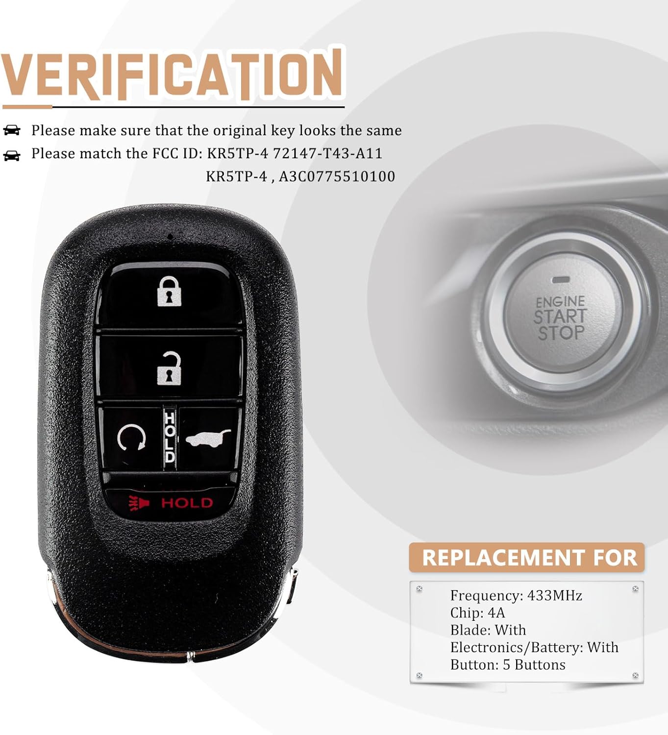 The Best Affordable Brand New Proximity Smart KeyWe provide you with brand new replacement Proximity Smart Key remote select vehicles, remote comes with a battery already installed in the device.We test every single remote before we send it to make sure it is transmitting and functioning just like the original one.Keep in mind: The original key must have EXACTLY the same buttons, it to work.Compatible with:Honda CR-V 2023Honda Civic 2022-2023Honda HR-V 2022-2023Honda Pilot 2023Replacement for:Frequency: 433MHzChip: 4AFCCID: KR5TP-4Part Number: 72147-T43-A11 , KR5TP-4 , A3C0775510100Note: Please make sure the remote programming can work to your vehicle before asking the locksmith to cut or program the key in case of money loss.