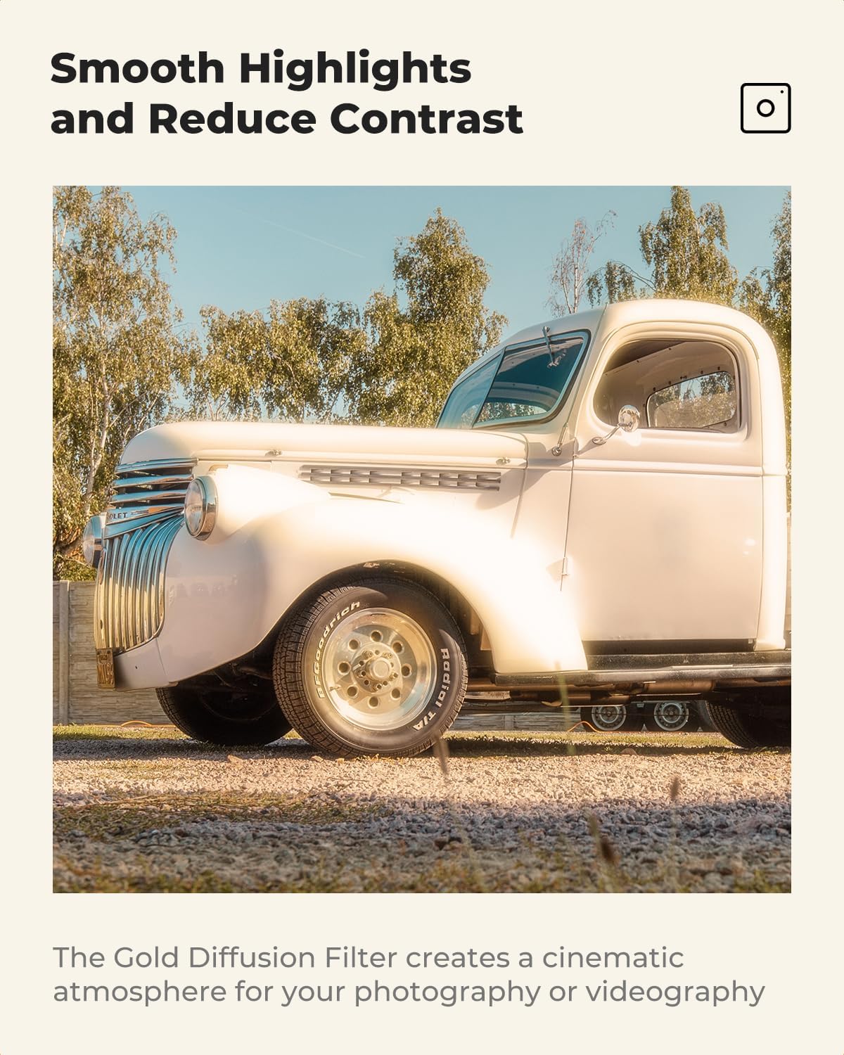 • Vintage Film Texture: This gold diffusion filter can soften highlights and reduce contrast, creating a cinematic atmosphere for your photography or videography.