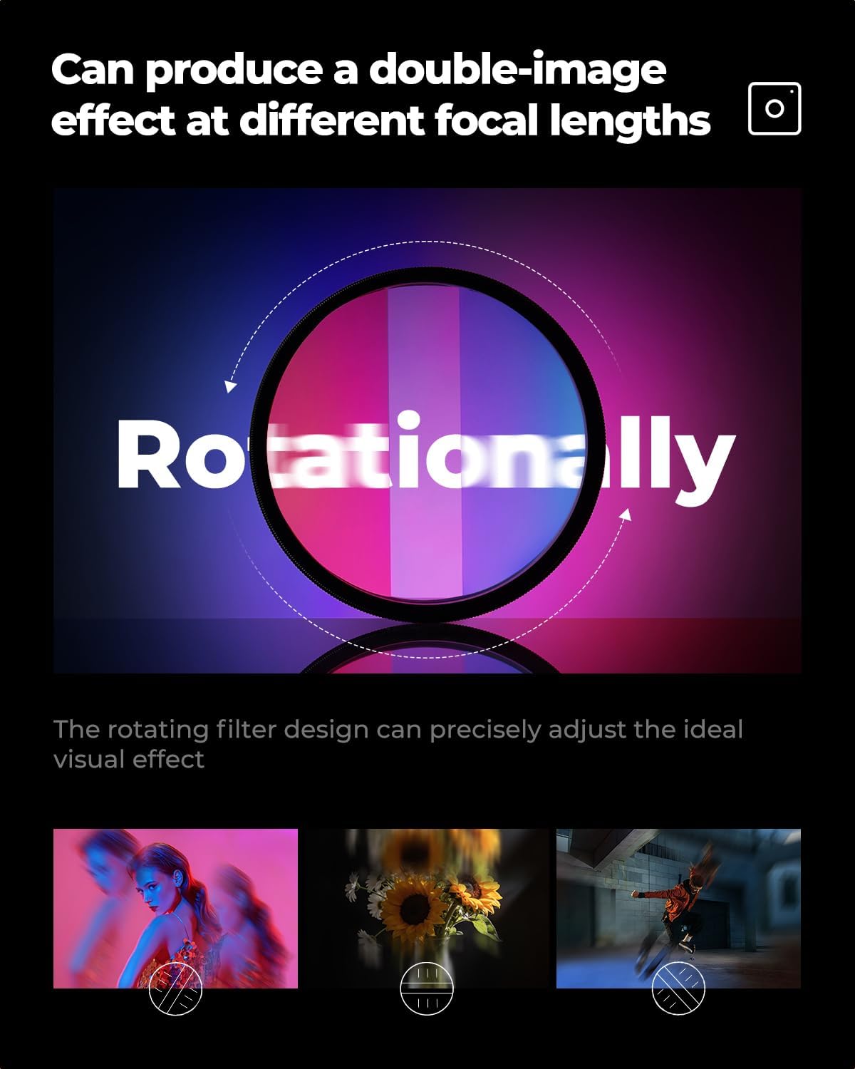 • 360 Degree Rotating: This filter can be rotated easily to help users realize different directions of effects, suitable for photo and video scenes to express the effect
