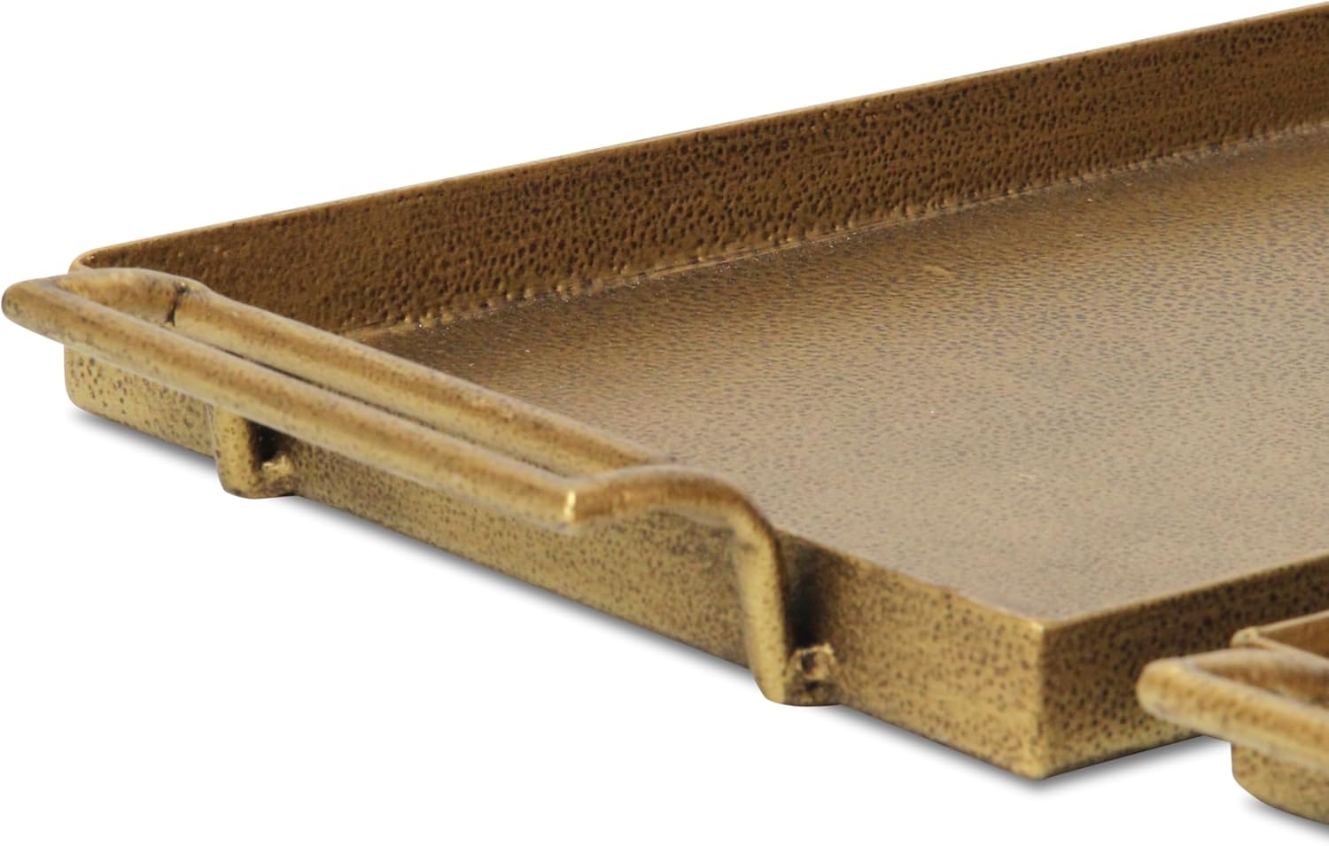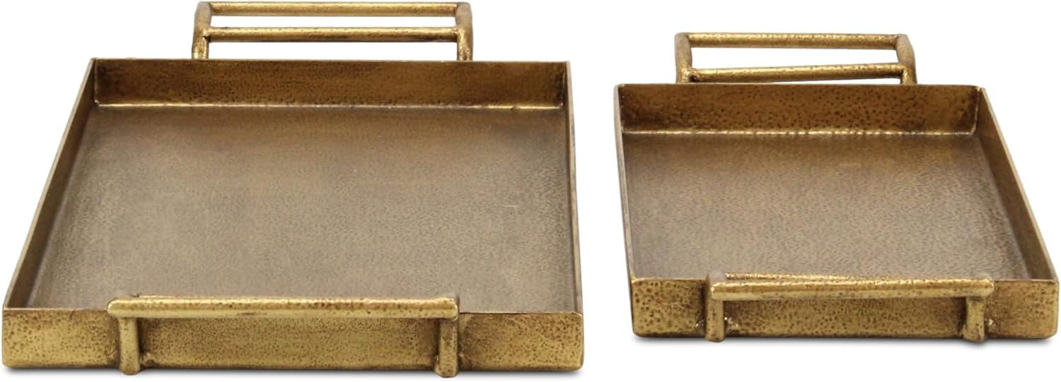 Elevate your table setting with our Khilvo Set of 2 Cast Iron Trays. Crafted by hand, these trays feature a charming dotted pattern and rustic gold finish, adding a touch of elegance to any occasion. With raised rims and side handles, they're versatile for serving appetizers, desserts, or as decorative accents in your home.