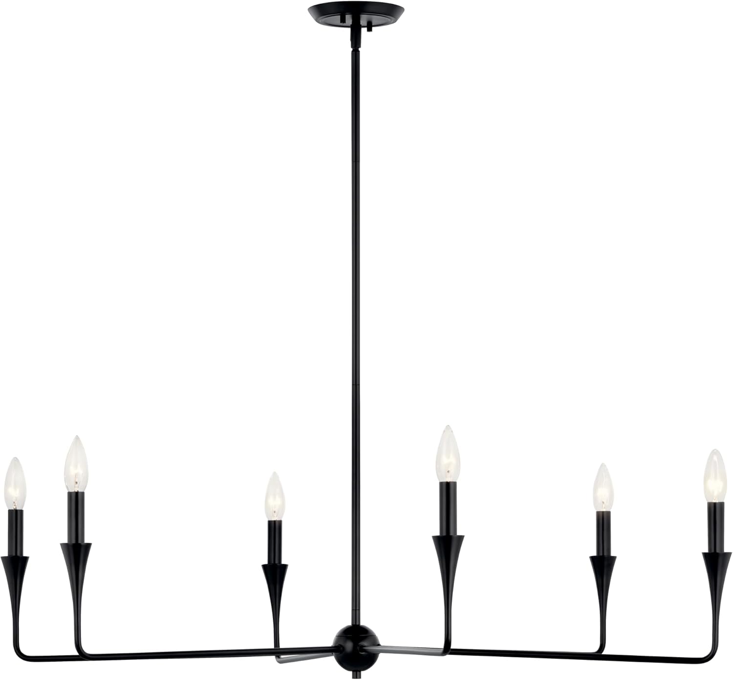 The Alvaro chandelier features a simple silhouette and unique tapered accent. Designed with 90-degree angles, Alvaro starts at the canopy, floats down to the center root of the fixture, and then glides outward and upward with a bloom of light at the end.This fixture also features bobeche on each arm — flaring out into the candlestick for a soft modern look. For a more contemporary style, use a G bulb and for a more traditional look, use a candelabra bulb.