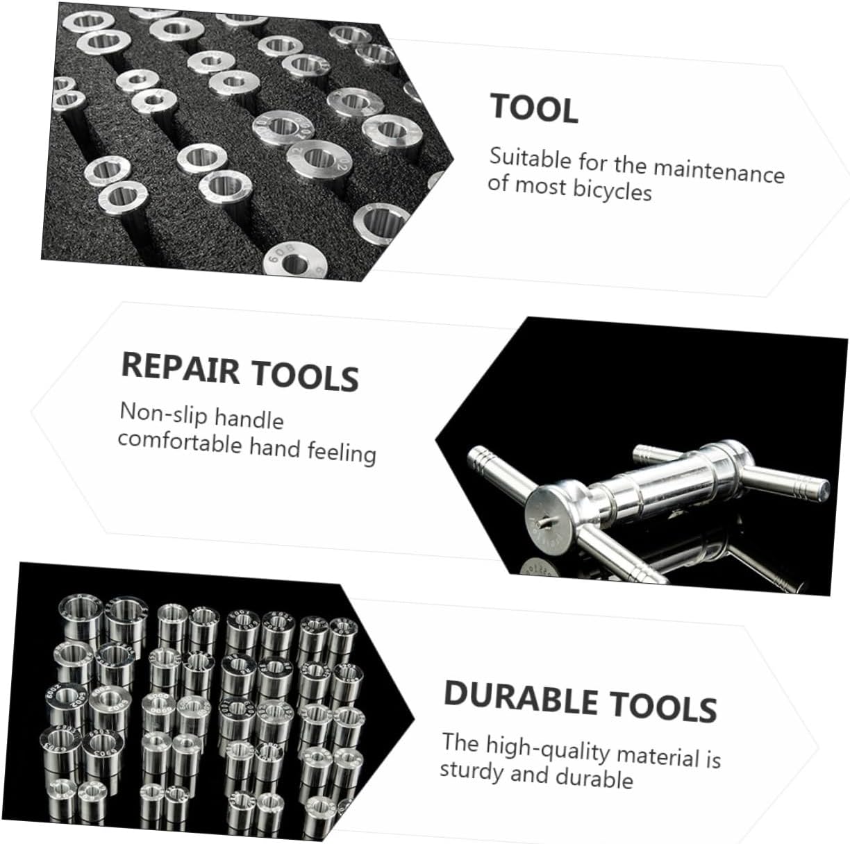 Package Include 1 x Set Bike Repair Tools Features -Size: About 33.00X27.00X8.20cm/ 12.97X10.61X3.22in Bike Repair Tools. -Material: Aluminum Alloy, CNC Bearing Press Tools. -Color: As Shown Simple Bike Repair Tools. - Suitable for the maintenance of bicycles Bearing Installation Kit. - The material is sturdy and durable, and the cutting has been specially heat-treated to have excellent sharpness Wear-resistant Bike Repair Tools. - Non-slip handle, comfortable hand feeling, time-saving and labor-saving in use Bike Wheels Tools. - It is a helper for home auto repair Installation Tools. - The tool set has a complete range, which is suitable for most situations Repair Tools.Goods InformationBike Repair Tools Non-slip handle, comfortable hand feeling, time-saving and labor-saving in use.Bike Wheels Tools These tools are made of materials, sturdy and durable, and the cutting has been specially heat-treated to have excellent sharpness