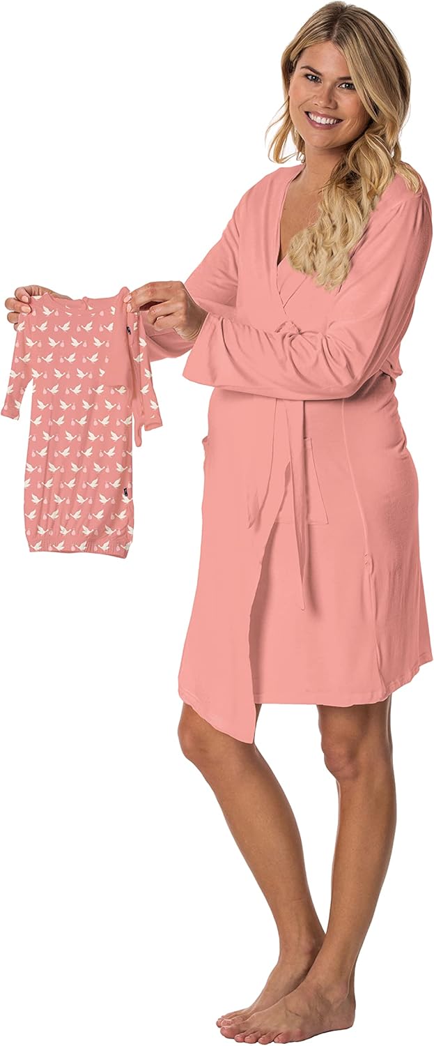 Keep enjoying a KicKee favorite! Our Basic Robe now has extra stretchiness for a loose fit during and after your pregnancy! And once your little peanut enters the world, you can snuggle them up in a matching layette gown topped with a darling knot hat. This women’s robe will wrap you in buttery-soft comfort. It’s long, extra roomy, and silky soft against your skin. Plus, this robe comes with a matching layette gown and darling knot hat for your new baby. Our KicKee Signature Blend fabric is extra smooth thanks to viscose from bamboo (organically grown and sustainably sourced) and stretchy from spandex so that it’s flexible, breathable, and moisture-wicking to keep you cool and dry. Best of all, our sleepwear is always tag-free. Your robe and gown are easy to care for: simply machine wash cold with similar fabrics on a gentle cycle and tumble dry low. Pair this robe with other super soft pajamas for both Mom and Baby in matching prints and coordinating colors. Check out our selection at the KicKee Amazon Store and outfit the whole family!
