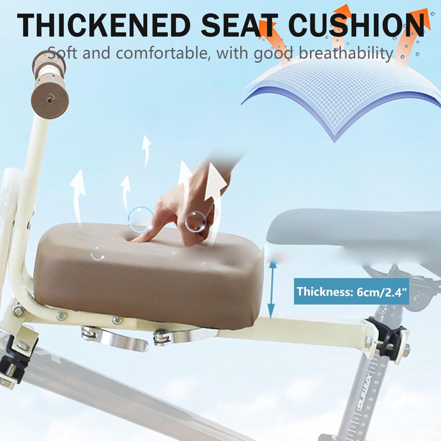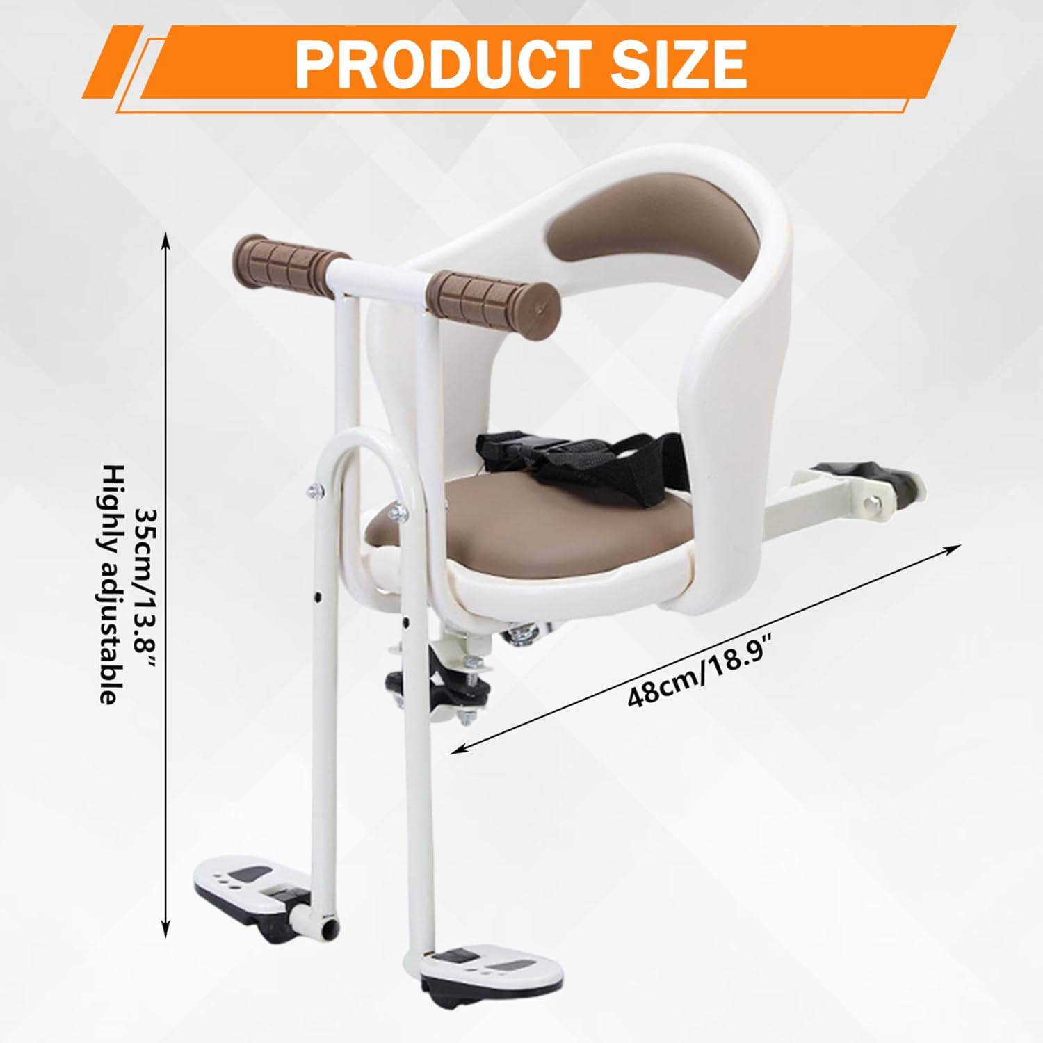 Description: This kids bike seat with a thickened comfort cushion is designed to provide safe and comfortable rides for children aged 6-36 months, suitable for boys and girls. Featuring a reliable 2-point screw fixation mounting system paired with a safety harness that absorbs shocks, it guarantees superior stability and enhanced protection for your child during bike rides. The footrest is adjustable in height and foldable, accommodating growing toddlers while allowing flexible storage options. The breathable, thickened cushion ensures long-lasting comfort and airflow, preventing discomfort even on extended rides. Reinforced steel tubing provides sturdy support and durability compatible with standard and e-bikes. Ergonomic handrails and adjustable pedals improve grip and convenience, making every bike ride secure and enjoyable for both child and parent. This child bike seat combines safety, comfort, and adaptability, making it an ideal choice for active families seeking reliable bike attachments for kids. Features:. -Color: White/Black. -Material: Metal. -Size: 35x48 cm/13.8x18.9 inch. -Age: For Kids 6-36 months. Note:Manual measurement, please allow slight errors on size.The colors may exist slight difference due to different screens. Package Including 1 * Baby Bike Seat