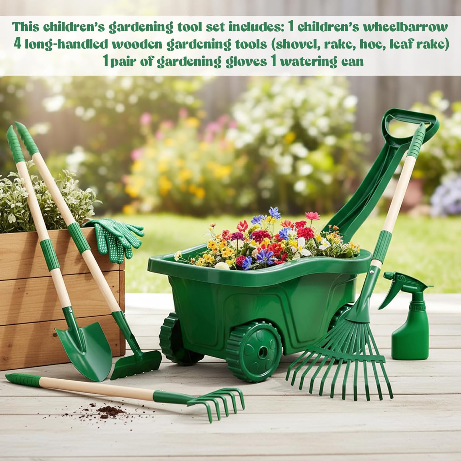 Description: This comprehensive 7-piece Kids Gardening Set is thoughtfully designed to inspire toddlers to explore nature through safe, engaging outdoor play. Equipped with a child-sized green wheelbarrow and four long-handled wooden tools including a shovel, rake, leaf rake, and hoe, plus gardening gloves and a spray bottle, it provides a full gardening experience perfect for little hands. Crafted from , materials, the set ensures safety and longevity while supporting skill development and environmental awareness. Ideal for backyard play, it helps children enhance fine motor skills, understand plant growth, and develop a love for nature. This gardening kit encourages family interaction and makes a productive alternative to screen time, fostering healthy habits and outdoor enjoyment. Perfect for young kids eager to help in the garden, it keeps their seeds, tools, and watering cans organized in one easy-to-move wheelbarrow, making gardening fun and accessible. This set combines educational with playful design, making it an excellent gifting for fostering creativity and outdoor activity. Features:. -Color: Green. -Material: Steel. Note:Manual measurement, please allow slight errors on size.The colors may exist slight difference due to different screens. Package Including 1 * Kids Gardening Set