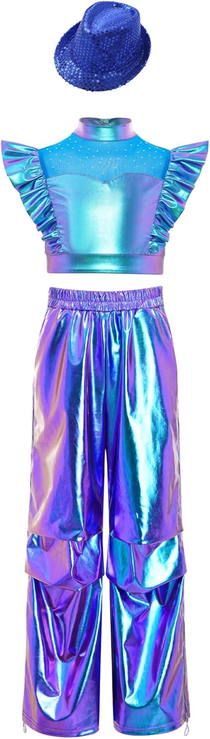 Set Include: 1Pc Crop Top, 1Pc Pants, 1Pc Hat Condition: New with tags Material: 85% Polyester, 10% PU, 5% Spandex Tag No.---|---Recommended Size---|---Pants Length---|----Pants Waist---|-------Hip------|----Top Length----|------Chest-- ---6------|-----------6 Years----------|-----29"/74cm-----|---19.5"/49.5cm---|---31.5"/80cm---|----10"/26.5cm----|---23.5"/60cm ---8------|-----------8 Years----------|----31.5"/81cm----|----20.5"/53cm----|---33.5"/85cm---|----11"/28.5cm----|---25.5"/65cm ---10-----|----------10 Years----------|----34.5"/88cm----|----22"/56.5cm----|----35"/90cm----|----12"/30.5cm----|---27.5"/70cm ---12-----|----------12 Years----------|-----37"/95cm-----|----23.5"/60cm----|----37"/95cm----|---12.5"/32.5cm---|---29.5"/75cm ---14-----|----------14 Years----------|-----40"/102cm----|----25"/63.5cm----|----39"/100cm---|---13.5"/34.5cm---|---31.5"/80cm ---16-----|----------16 Years----------|----42.5"/109cm---|-----26"/67cm-----|----41"/105cm---|----14"/36.5cm----|---33.5"/85cm
