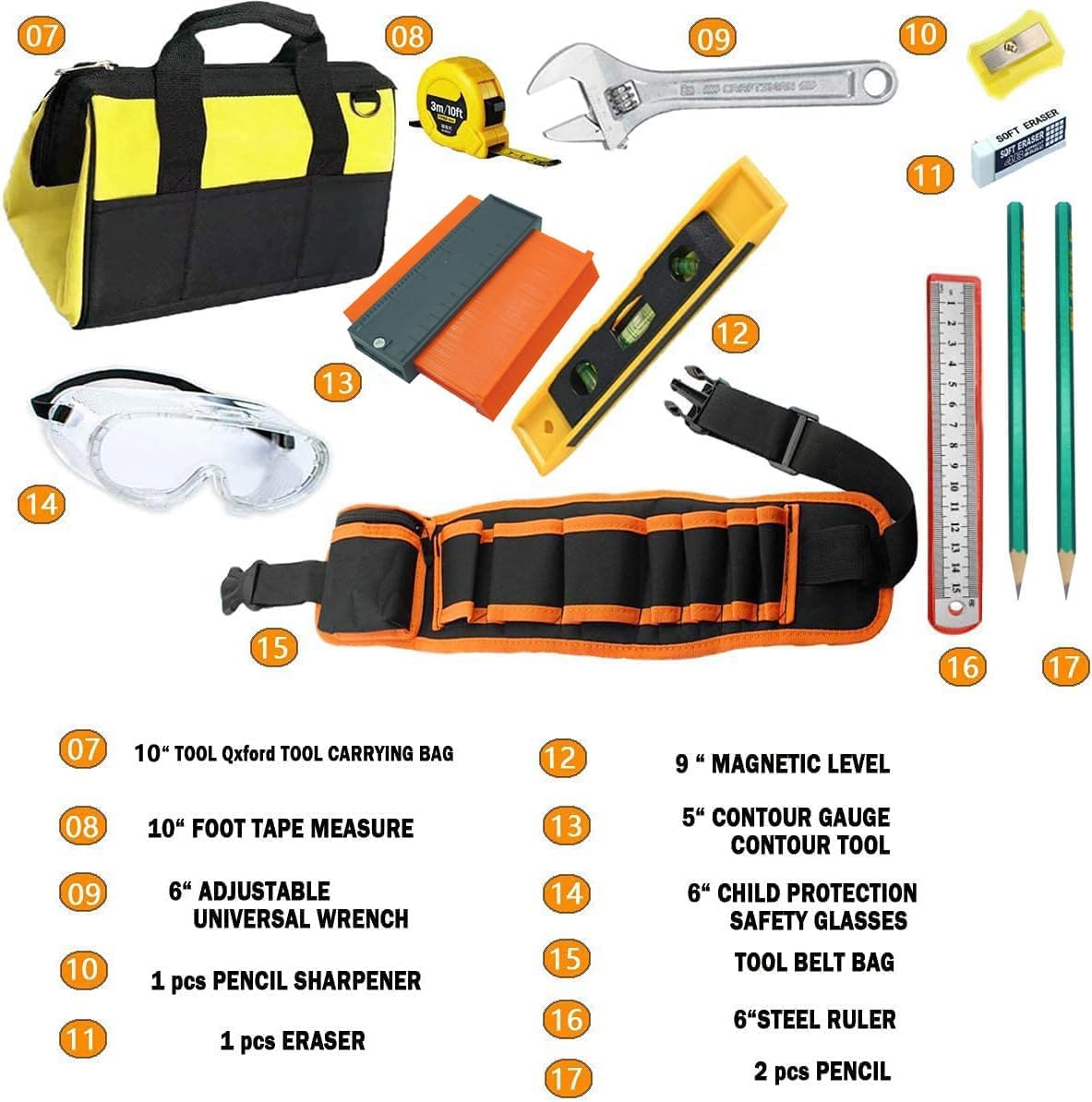 | Included Components | Stubby claw hammer, needle nose pliers, adjustable wrench, 10ft tape measure, kids safety glasses, magnetic flat & Phillips screwdriver, steel ruler, magnetic level, tool belt bag |