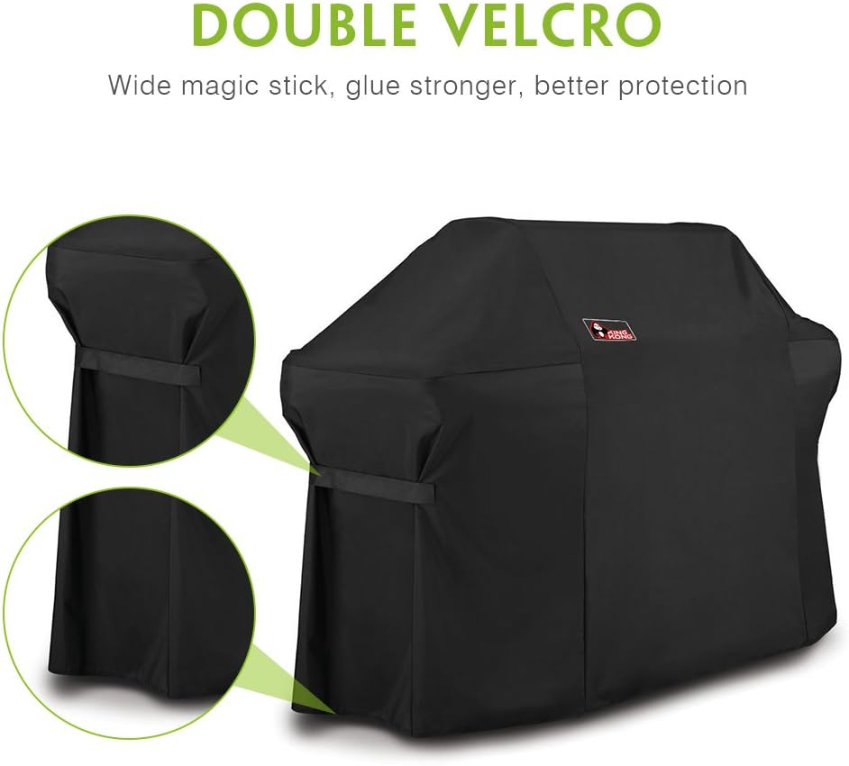 Kingkong black cover (74.8 x 26.8 x 47 inches) made of 100% polyester. Fit: Weber summit 600-series gas grills including e-620, e-670, s-620 and s-670. Compared to the Weber 7109 grill cover. Functions: Wind resistant, rain resistant, snow resistant, dust resistant, rip resistant. Advantages: Offered high quality , heavy duty and durable materials, innovative features, brush and tongs, Velcro straps, easy to fold down.