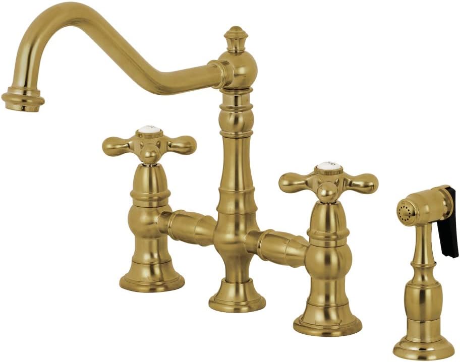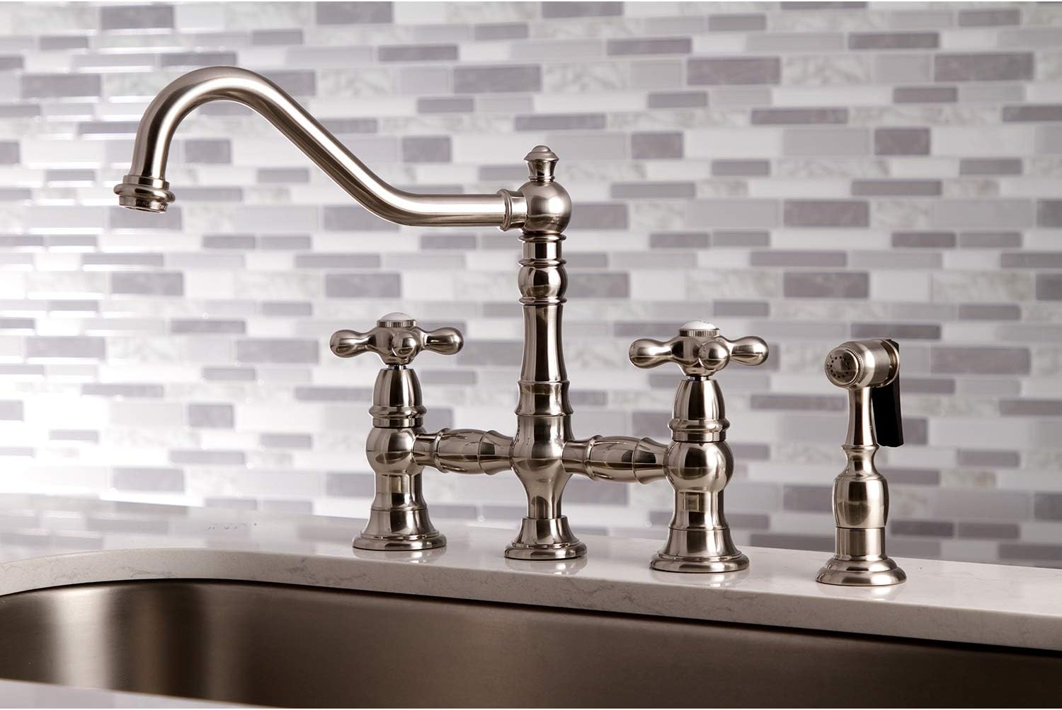 Classical artistry from the late 19th Century to early 20th Century is mirrored beautifully within this faucet's traditional charm. Whether you are striving for a Victorian-inspired kitchen or a vibrant 1950s-themed space, the unique bridge design is a highly favored option amongst those doing period-style kitchens. Because of its added architectural elements and detailing, the brushed nickel finish will pop against your surrounding kitchen decor. Allow the brass construction, side sprayer, and swivel abilities to provide a sturdy and reliant fixture, great for use with any sink.