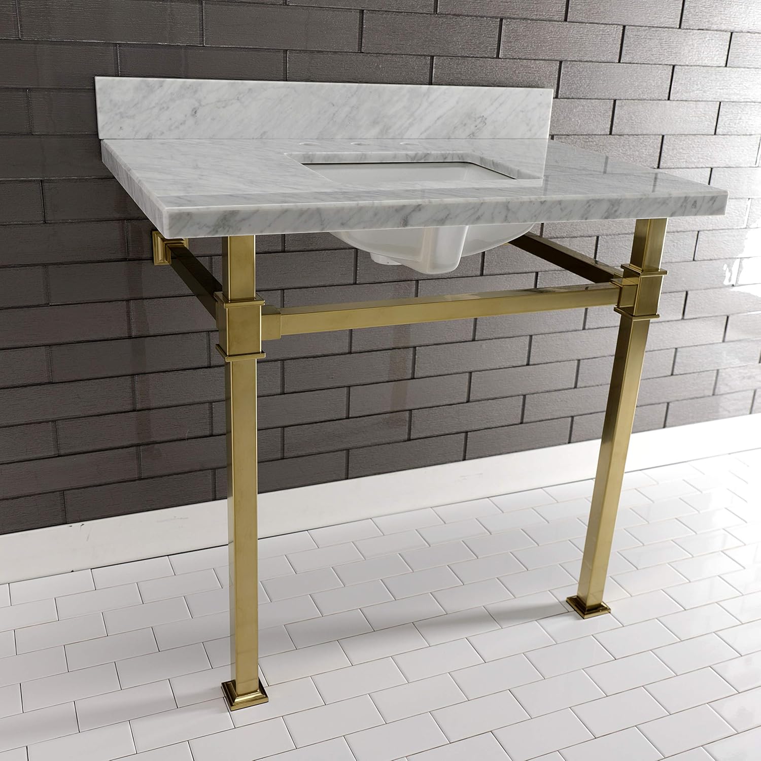 With a beautiful Carrara marble vanity top, this console sink set is a long lasting, durable, and elegant addition to your bathroom. A fabulous alternative where space is limited or tight, making them friendly for the whole family. With different shades and natural designs, otherwise known as veining, no two sinks will be alike. Also for your convenience, anti-slip rubber pads are included with the stainless steel legs to ensure steadiness. Water supply kit, drain assembly, and the faucet are sold separately. Kingston's carrara marble tops are polished, but they are not sealed. Polished marble has a shiny surface and resists stains. Natural stone, even when polished, is still somewhat porous and does remain susceptible to etching by acidic compounds like fruit juice, vinegar, some cleaning solvents, etc. For customers that wish to further protect their investment the granite can be sealed. The following is intended solely for informational purposes. Kingston does not warranty nor accept liability for damages or other negative outcomes resulting from any treatment or coating applied to the countertop after purchase, whether applied by the customer or by a third party. For anyone unfamiliar with this nature of project, Kingston recommends consulting an experienced professional in your area. When looking for a sealant product, please be sure to seek a product specifically designed for use on polished granite surfaces. Be sure to always avoid anything containing a citrus ingredient, acid ingredient, tung oil, linseed oil, or other natural oils. These can damage or discolor your granite.