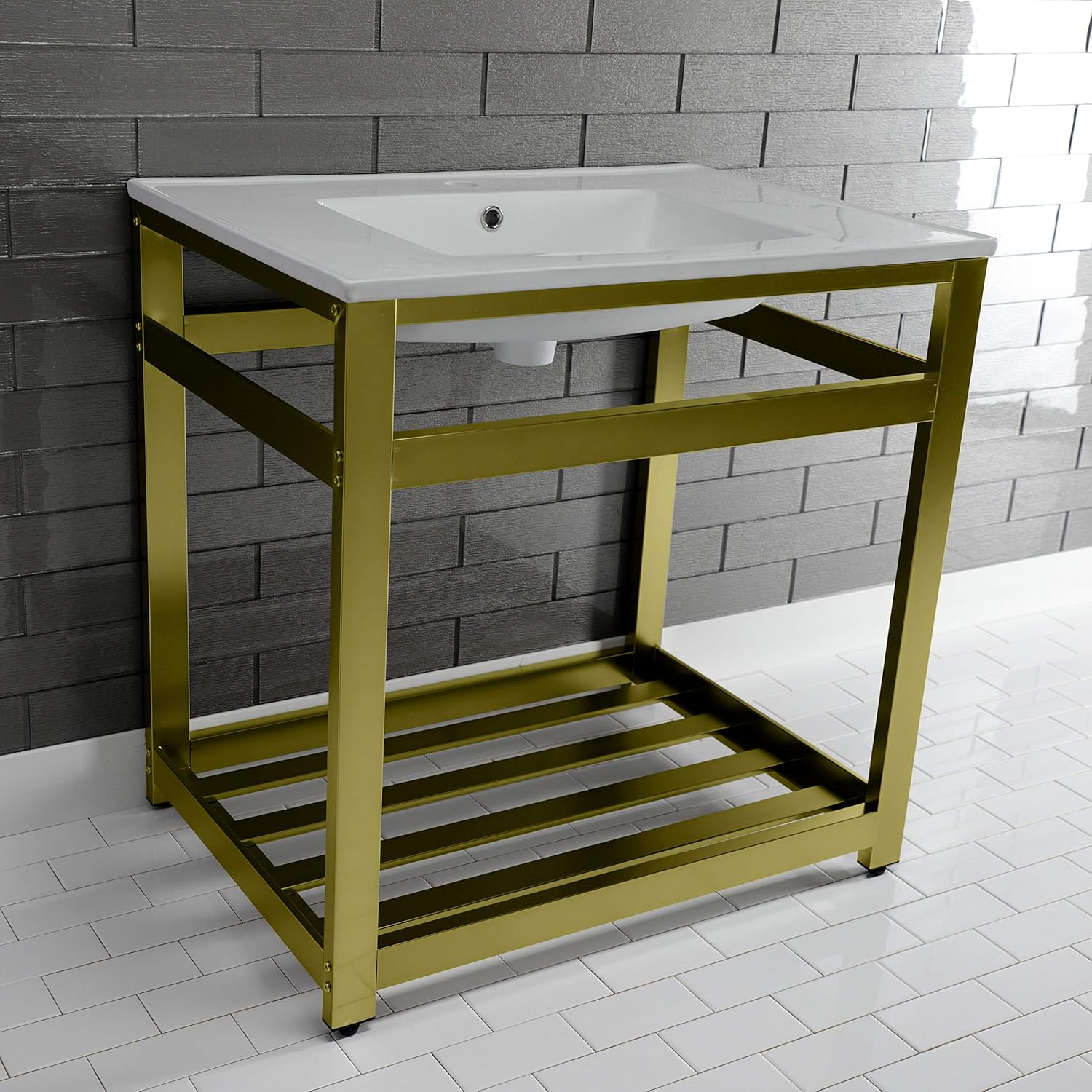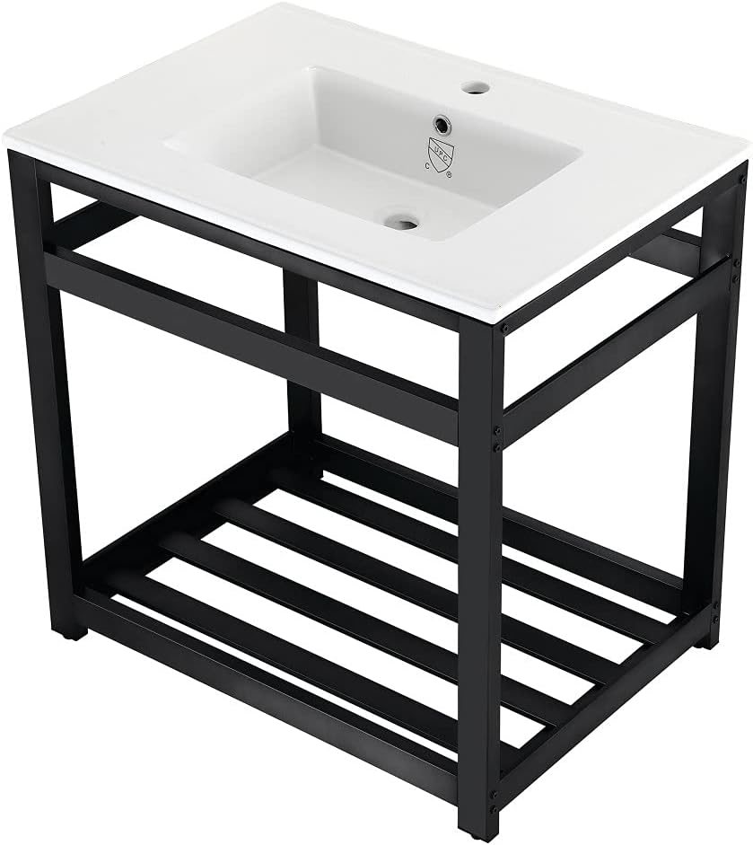 Exquisitely styled for your contemporary taste, this console sink will enhance your bathroom living space. With a beautiful ceramic counter top, this console sink set is a long lasting, durable, and elegant addition to your bathroom. The Kingston Brass 31-inch ceramic console sink (1-hole) features a wash basin and steel base that is available in a handful of finish options. Solid ceramic sinks and tops like the LBT-series top in this listing are finished with a glossy glaze on the top and sink basin interior, making for a pristine, stain-resistant surface and glistening finish that is easily maintained. The underside and basin exterior are unglazed/unfinished and coated with a matte white protective sealant that prevents moisture absorption and staining. Solid ceramic pieces cannot be glazed on all sides, because the nature of ceramic material requires a minimum surface area be left raw during the glaze firing process so the piece does not explode. Water supply kit, drain assembly, and the faucet are sold separately.
