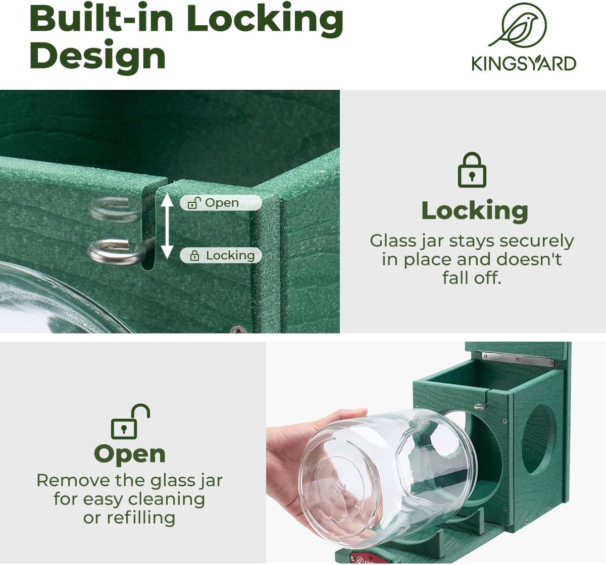 | Included Components | Feeder Box, Storage Jar, Lid, Mounting Hardware |