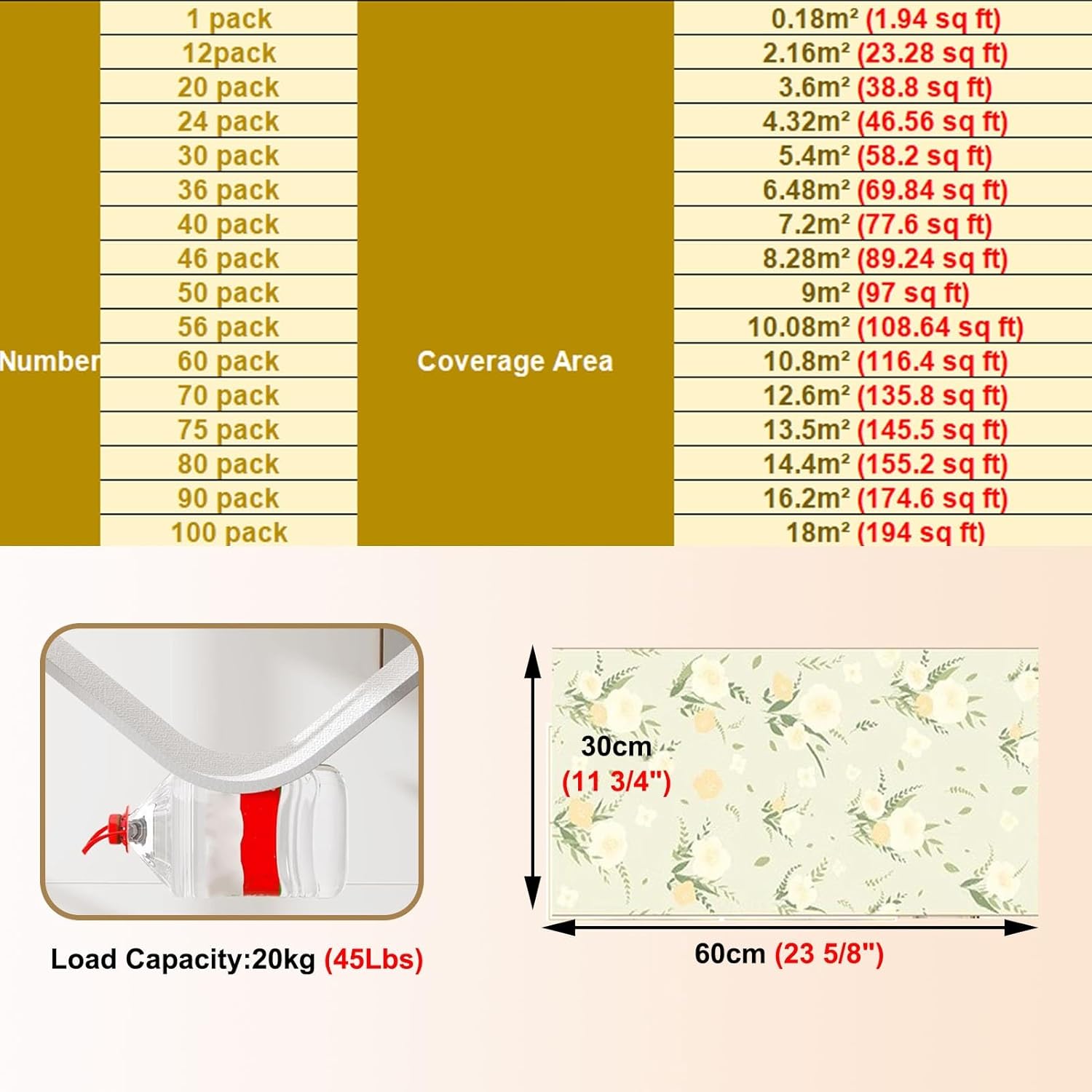 Are you worried about ugly, cracked, dusty ceilings?Our drop ceiling tiles help you remodel and renovate. Easily cover up unsightly, ugly, old ceiling boards!Are you worried that it won't stick well and fall off within a few minutes?Ceiling boards tile has a load-bearing adhesive of 20 kg (45 lbs) and is not easy to fall off!❉Package Include:- Ceiling Tiles❉Specifications:- Material: PVC surface + middle insulation cotton + high temperature resistant aluminum film- One Piece Size: 30x60cm (11 3/4" x 23 5/8")- One Piece Load Bearing: 20kg (45Lbs)- Thickness: 2mm (1/8")- Please use a card to scratch smoothly during installation to avoid air bubbles.❉Applicable Scope:- 1 Pack Tiles - Covering about 0.18m² (1.94 sq ft)- 5 Pack Tiles - Covering about 0.9m² (9.69 sq ft)- 10 Pack Tiles - Covering about 1.8m² (19.38 sq ft)- 25 Pack Tiles - Covering about 4.5m² (48.44 sq ft)- 40 Pack Tiles - Covering about 7.2m² (77.5 sq ft)- 50 Pack Tiles - Covering about 9m² (96.88 sq ft)- 70 Pack Tiles - Covering about 12.6m² (135.8 sq ft)- 100 Pack Tiles - Covering about 18m² (194 sq ft)❉Applicable Scenarios:- Can be used in offices, restaurants, farmhouses, etc.❉Note:- Please confirm the required area before placing an order to avoid insufficient area upon arrival.- The back paper is difficult to tear apart. Please use a hair dryer to blow it hotly. It will make it much easier to tear it a lot.- If you are worried about the edges being raised, please use glue to reinforce them. (Excluding adhesive / glue)- After pasting, press continuously for 2-3 seconds to fully fit the adhesive and the ceiling to avoid falling.- If you have any questions, please contact us by email.