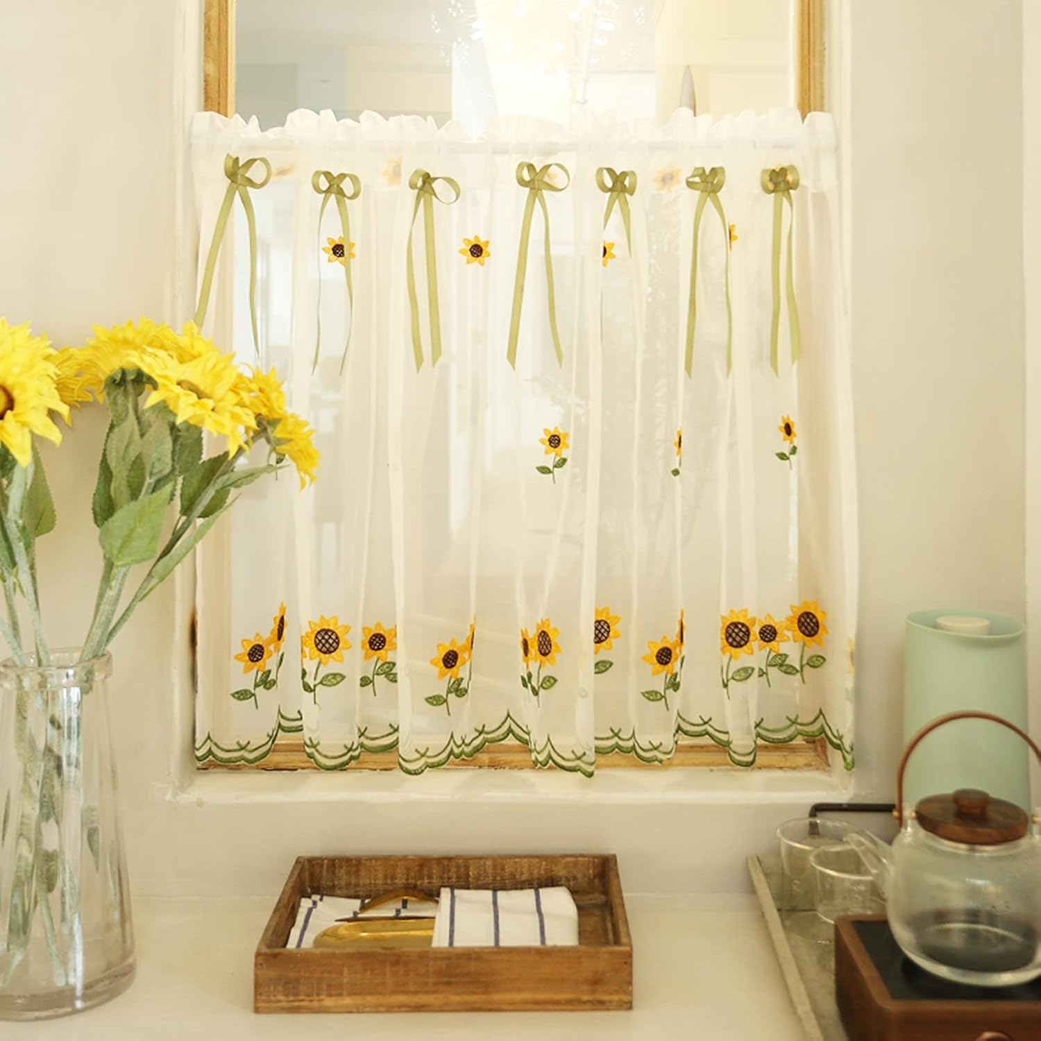 ✽ The white tulle curtains combined with the elaborate structure are romantic and beautiful, increasing the fluffy feeling after the folds, and showing more agility and fairy spirit.✽ Beautiful sunflower embroidery gives your house a classic and elegant feel. Add natural beauty to your room and bring your mind into true nature.✽ Translucency not only allows you to enjoy the view out of the window, but also gives your room a blurry feel from the outside.✽ The pole pocket allows you to easily slip it onto the pole. Fits most standard or decorative curtain rods.✽ Specifications* Product Name: Sunflower embroidery Short Half Curtain* Style: Modern fresh country style* Material: Polyester* Color: White* Size: WidthxHeight. * Function: Decoration, Semi-shading (40-70%)* Use place: Cabinet, small window, cupboard, interior door.* The package includes: 1 short curtain (not including the rod)✽ Care instructions Gently hand wash in lukewarm water or machine wash in a laundry bag, do not bleach. Do not scratch the curtains with sharp objects.✽ Tips* The size is measured by hand, there may be 1-3 cm error.* For proper padding, the panel should be 1.5 to 2.5 times the width of your window (Example: if you have a 100cm wide window, we suggest you buy 150 - 200cm.)* For the whole large window, 2 panels would be prettier.* Due to the condition of the monitor, the color of the picture and the actual product may differ. Please understand this beforehand.