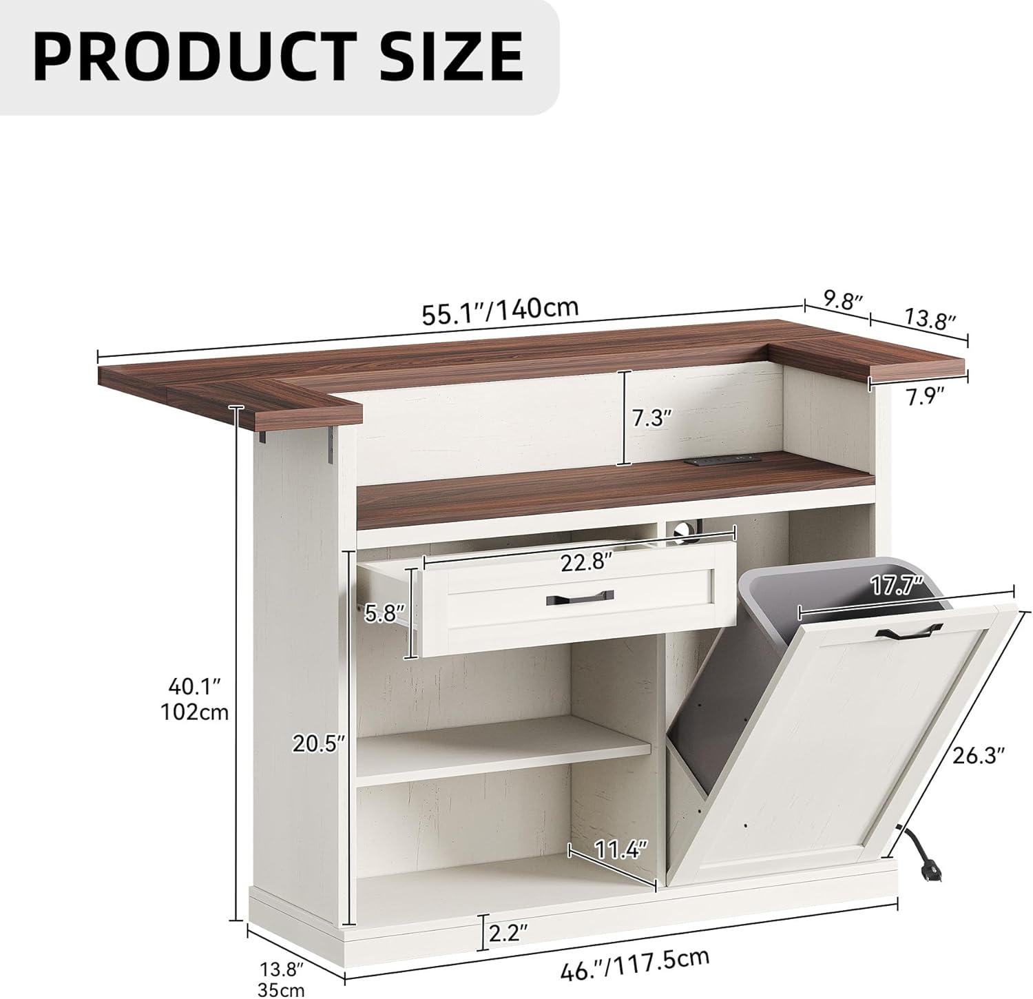 | Included Components | 5 Wheels, Power Outlet, Drop Leaf Countertop, Storage Cabinet, Drawer, Trash Can Cabinet |