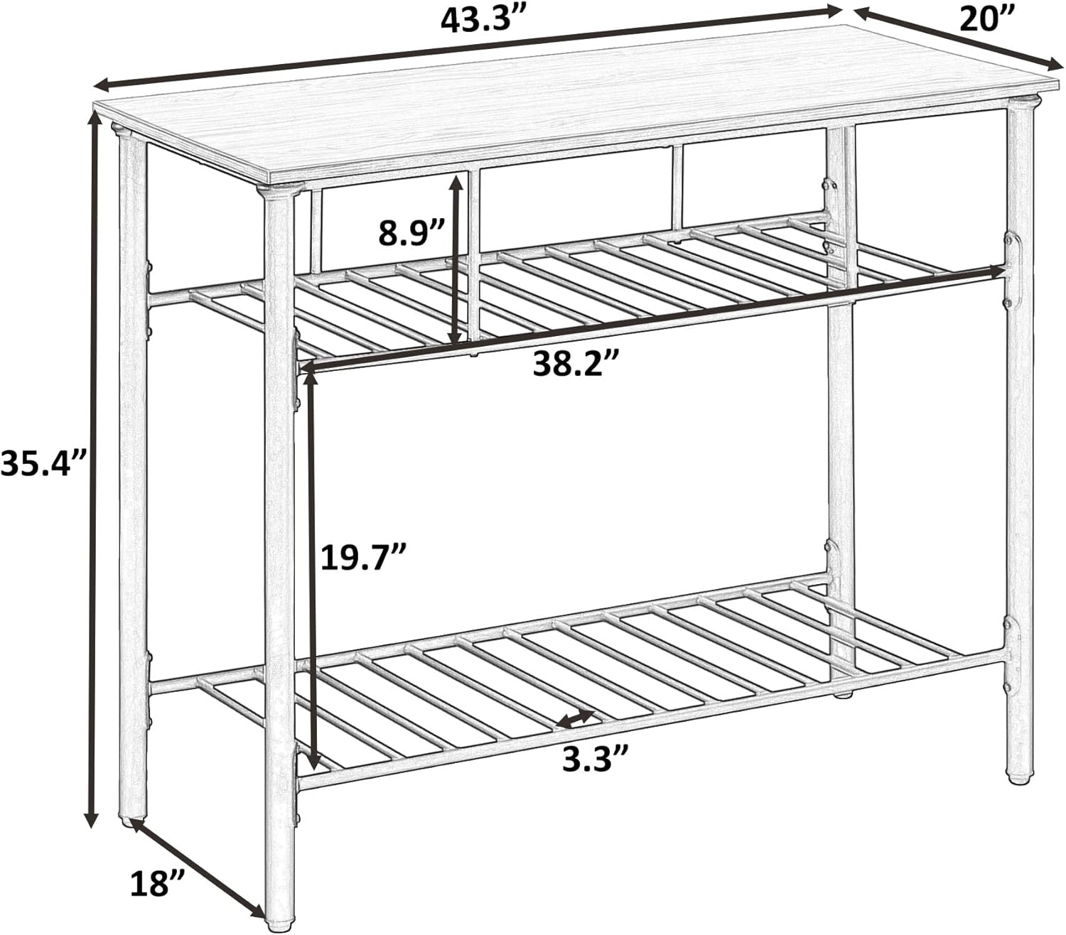 Main Color: WhiteMain Material: MetalProduct DimensionsAssembled Length (in.): 43.3Assembled Width (in.): 20Assembled Height (in.): 35.4Weight (lbs.): 27 Package SizeLength (in.): 48.43Width (in.): 22.83Height (in.): 5.12Weight (lbs.): 33.07Weight Capacity: Top: 225lbs Metal Rack:150lbsAssembly Required YesMaintenance&NoticeWood Furniture Care We recommend dusting frequently with a clean, soft, dry, lint-free cloth. Clean the surface by rubbing in the direction of the grain and wipe dry.Assembly Notice Please read assemble manual in advance. Please do not over-tighten nuts, as this may cause distortion or breakage.Color Notice Items may slightly differ from photo in terms of color due to the lighting or your monitor's display.Size Notice Manual measurement has been used, there may be some reasonable error.