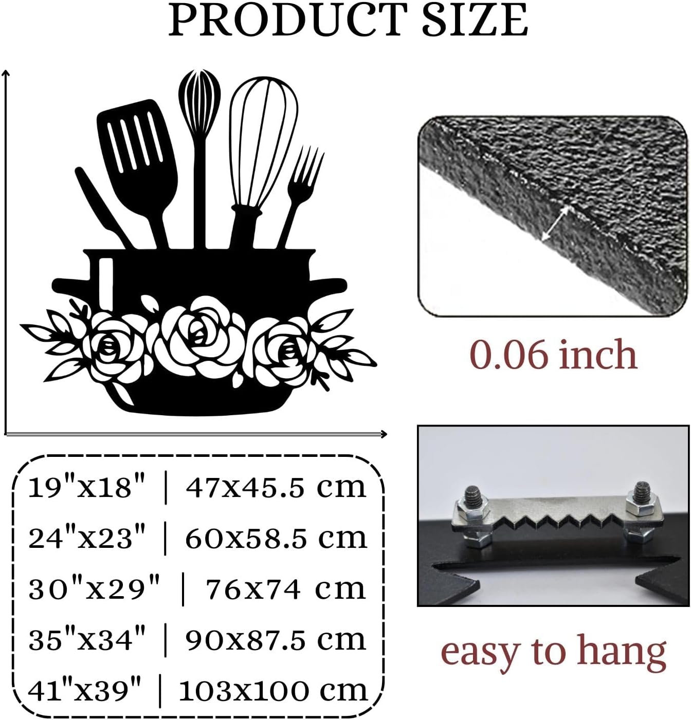 Our modern kitchen wall art is novel in style and high in accuracy, which you can't find anywhere else. Each metal kitchen sign wall decor is made of high quality steel, carefully crafted and coloured to create a unique piece of metal art. Vintage kitchen wall decorations are available in a wide range of sizes and colours, so you can find the perfect fit for your space. All materials used in making kitchen wall art are safe for health and the environment and do not contain any harmful chemicals or odours. Material: Wrought Iron Colors: Black, White, Silver, Gold Metal Wall Decor Dimensions: 19"x18" | 47x45.5 cm 24"x23" | 60x58.5 cm 30"x29" | 76x74 cm 35"x34" | 90x87.5 cm 41"x39" | 103x100 cm Thickness: 0.06 inches Installation Type: Wall mount Package Includes:1 x Kitchen Metal Wall Art Attention: Manual measurement, please allow slight errors on size. The color may exist a slight difference due to different screen displays.