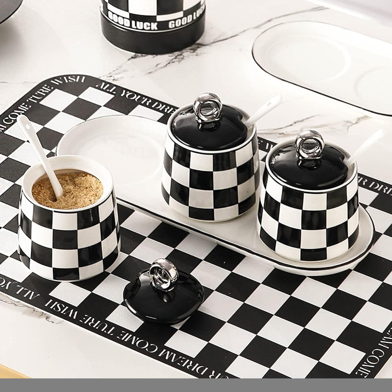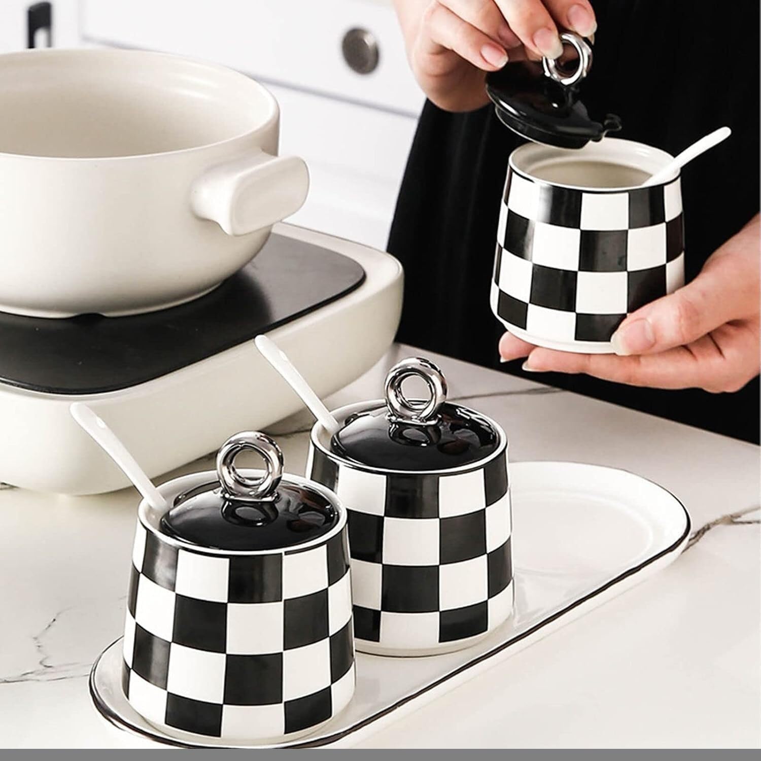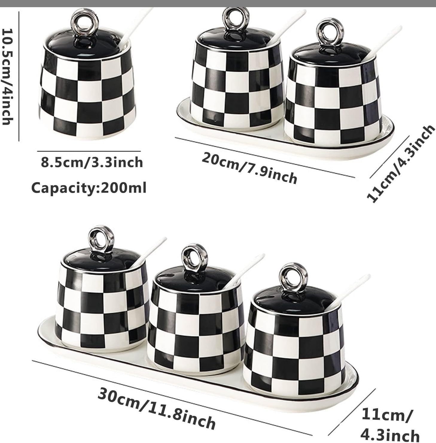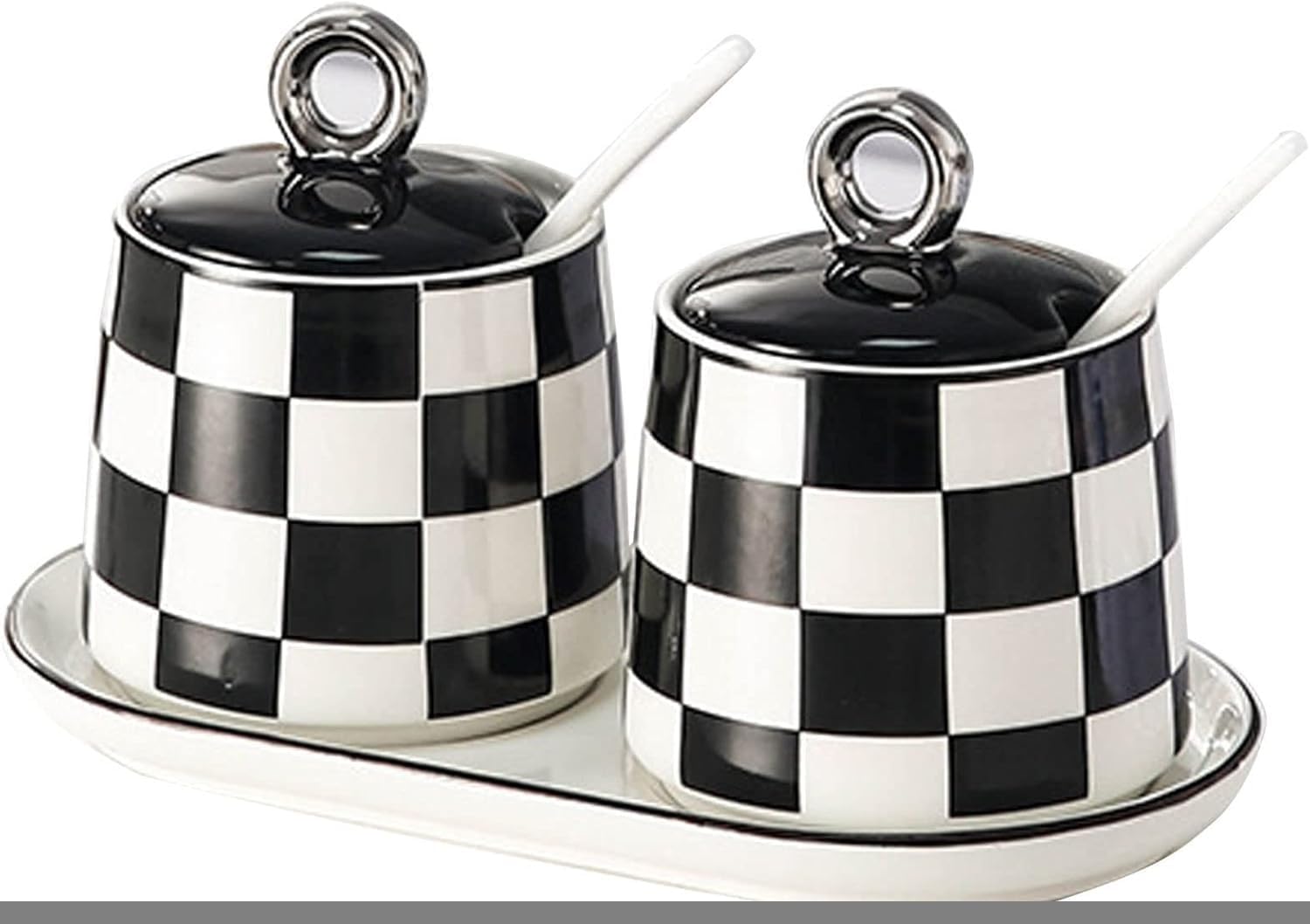 Enhance your kitchen organization with our elegant Condiment Containers and Spice Storage Jars. This beautifully designed set features a checkerboard grid pattern that adds a touch of charm to your countertop. Each ceramic spice jar comes complete with a lid and spoon, allowing for easy access to your favorite seasonings while keeping them fresh.Spice ContainersOur salt boxes with lids and spoons are great for storing spices, herbs, salt, sugar, pepper, rosemary, sesame and more, practically helping to keep your seasonings fresh and dry. You can also keep small items like paperclips and jewelries. Great idea for gifting them to your family, friends and loved ones!Application-Very suitable for storing condiments/storage condiments, snacks, sugar, pepper, beans, salt, etc. It's at your fingertips on the counter where you are cooking. The lid prevents splashes from contaminating the contents. The suit looks good on the counter. You will like this set.-For decoration purposes, making personalized gifts, housewarming projects, wedding banquets.MultipurposeWidely used at home, coffee bar, hotel, buffet serving for sugar, salt, spice, seasoning, pepper, corn starch and more.Specifications:Type: Spice jar setMaterial: ceramic