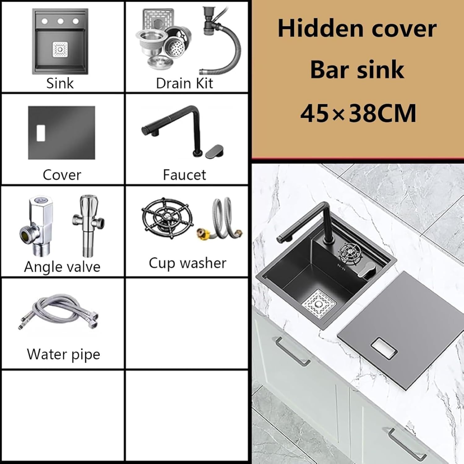Our sink is a multifunctional decorative product for your home kitchen and can be used for washing vegetables and dishes.Product Specifications:Product Name: SinkMaterial: Stainless SteelApplication: Living Room/Dining Room/Bathroom/Kitchen/Bar/Pantry/Studio/BalconyInstallation Method: Over-counter, center-mount, under-counterSize: 45 * 38 * 22 cm (17.7 * 14.9 * 8.66 inches)Daily Maintenance Tips:1. Always use products to keep the sink clean.2. Clean the surface of the sink with water or a neutral detergent and then dry it with a soft towel.3. Pay attention to where agents are hidden. This will help preserve the product after.Reminder:We only sell sinks and accessories, no other products are included.Different measurement methods may result in slight size variations. Please refer to the actual product.Due to differences in shooting equipment, minor color variations may occur, which do not constitute a quality issue. Please refer to the actual product.