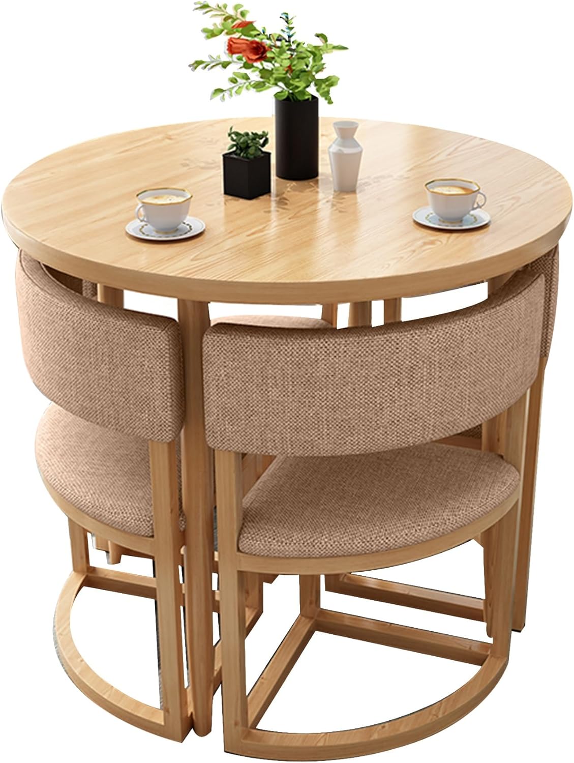 The innovative design of this section does not take up much space for storage,make the objects in the space more flexible.Product Name:Kitchen Table and Chairs for 4/Round Dining Room Table Set for 4Table Diameter:80cmProduct Style:simple and modernProduct Highlights:Save spaceTable and Chair Set Includes:1 table and 4 chairs with backrestChair Material:There are the cotton linen fabric and PU can chooseSuitable for scene:Bedroom, cafe, living room, kitchen, terrace, restaurant, lounge, office, tea house, bakery, reception center, hotel, negotiation room, bar, etc.Tips:1. About color---------There may be color difference due to display screen or shooting light, please understand!2. About size---------Due to different measurement methods, there may be an error of 1~2cm, please understand!3. About service---------If you have any questions, don't worry, please contact us as soon as possible, we will solve your problem within 24 hours.