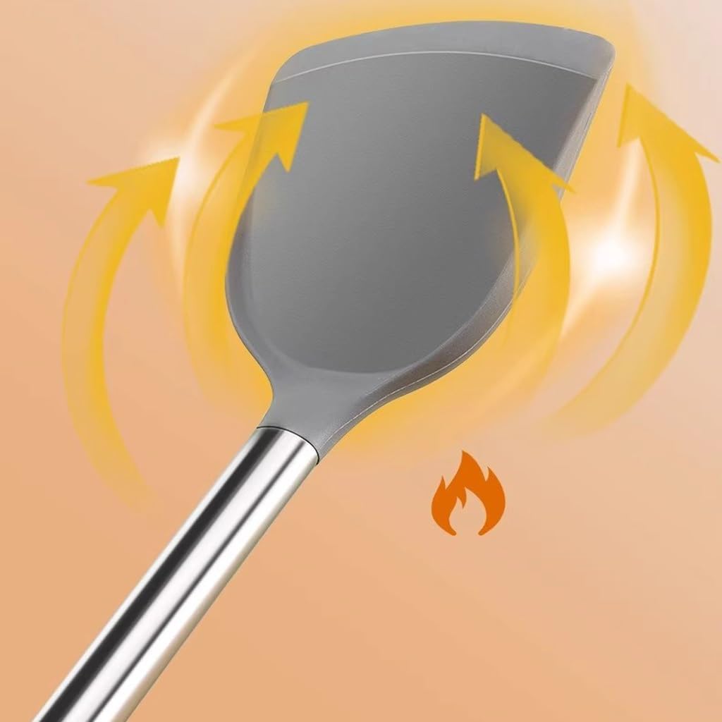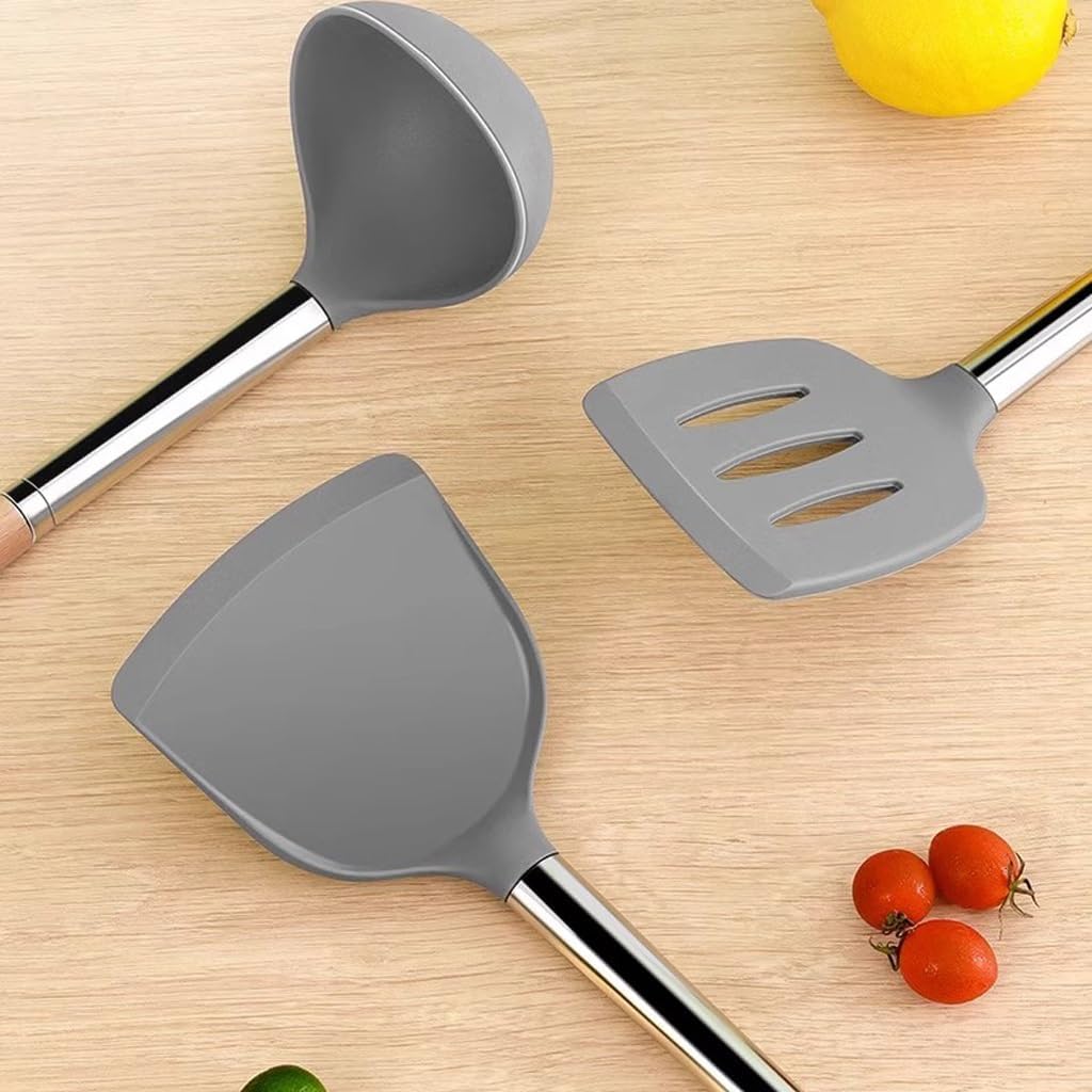 Occasionally getting oil stains, rinse gently with water.Comfortable to grip, easy to stir fry, and fits snugly with the palm of the hand.High temperature resistant material, can withstand high temperature use, and has no odor when cooking.Cooking is silent and without damaging the pot.scoop can be used for two purposes. Large capacity soup ladle can save the worry of hollowing out the top of Congee, and the soup can be filtered by tilting it.Name: Kitchenware SetMaterial: SiliconeColor: As shown in the pictureNumber of pieces: 3Specification: Kitchenware set * 11. Due to screen display differences, there may be slight color differences in the visual. Please refer to the product received.2. Manual measurement may have slight errors, please understand.High temperature resistant material, can withstand high temperature use, and has no odor when cooking